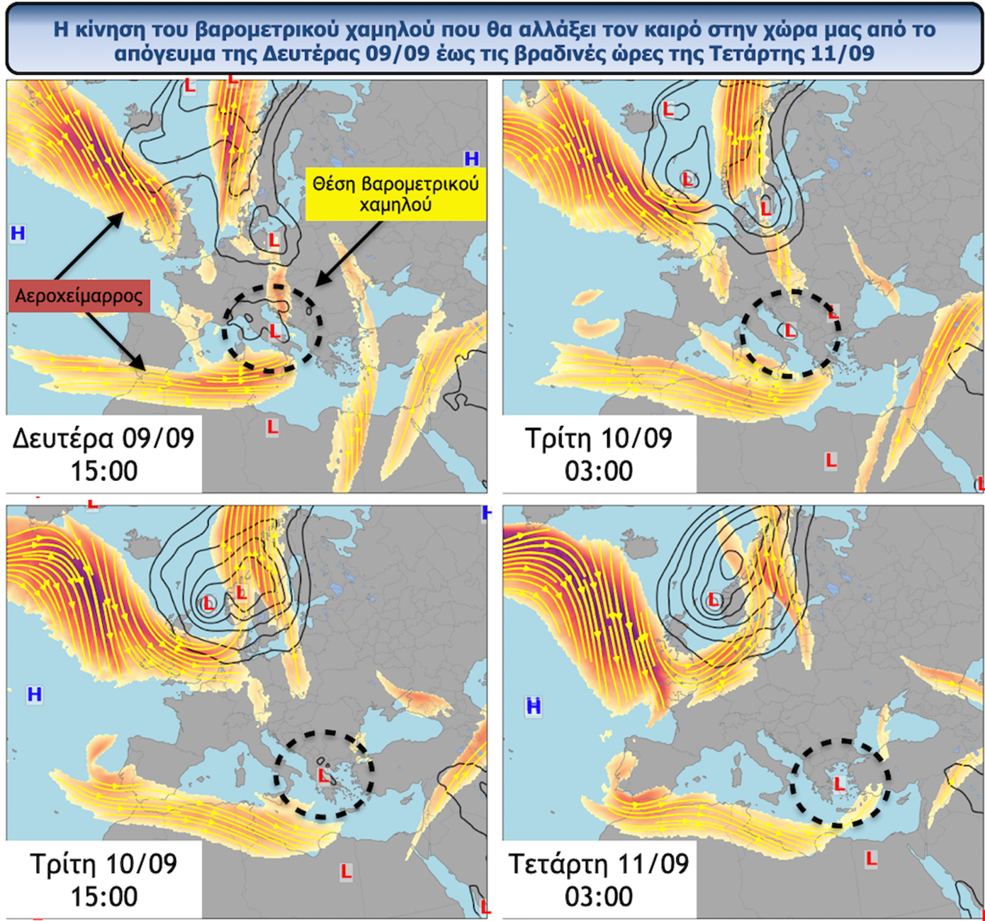 Παράλληλα, σύμφωνα με τα νεότερα προγνωστικά στοιχεία του meteo.gr/Εθνικού Αστεροσκοπείου Αθηνών, βροχές και καταιγίδες αναμένονται σε μεγάλο μέρος της χώρας από τις απογευματινές ώρες της Δευτέρας 09/09 έως τις βραδινές ώρες της Τετάρτης 11/09. Κύρια αιτία για αυτή την αλλαγή του καιρού είναι η μεταβολή της ατμοσφαιρικής κυκλοφορίας πάνω από την Ευρώπη καθώς και η θέση του αεροχειμάρρου (πορτοκαλί αποχρώσεις στην Εικόνα 1) πάνω από τη Μεσόγειο η οποία έχει συμβάλει στην ανάπτυξη ενός βαρομετρικού χαμηλού πάνω από την περιοχή της Ιταλίας (Εικόνα 1). Υπενθυμίζουμε ότι, ο αεροχείμαρρος είναι ένα ισχυρό ρεύμα αέρα σε ύψος περίπου 10-11 χιλιομέτρων από την επιφάνεια της γης με κίνηση κατά βάση από τα δυτικά προς τα ανατολικά και η κίνηση του καθορίζει τη δημιουργία και την κίνηση των βαρομετρικών συστημάτων. Η ανατολική-νοτιοανατολική κίνηση του βαρομετρικού χαμηλού από την περιοχή της Ιταλίας προς τα Νότια Βαλκάνια και τη χώρα μας κατά τη διάρκεια της Δευτέρας 09/09 θα έχει ως αποτέλεσμα τη σταδιακή αλλαγή του καιρού από τα δυτικά της χώρας μας με βροχές και καταιγίδες.