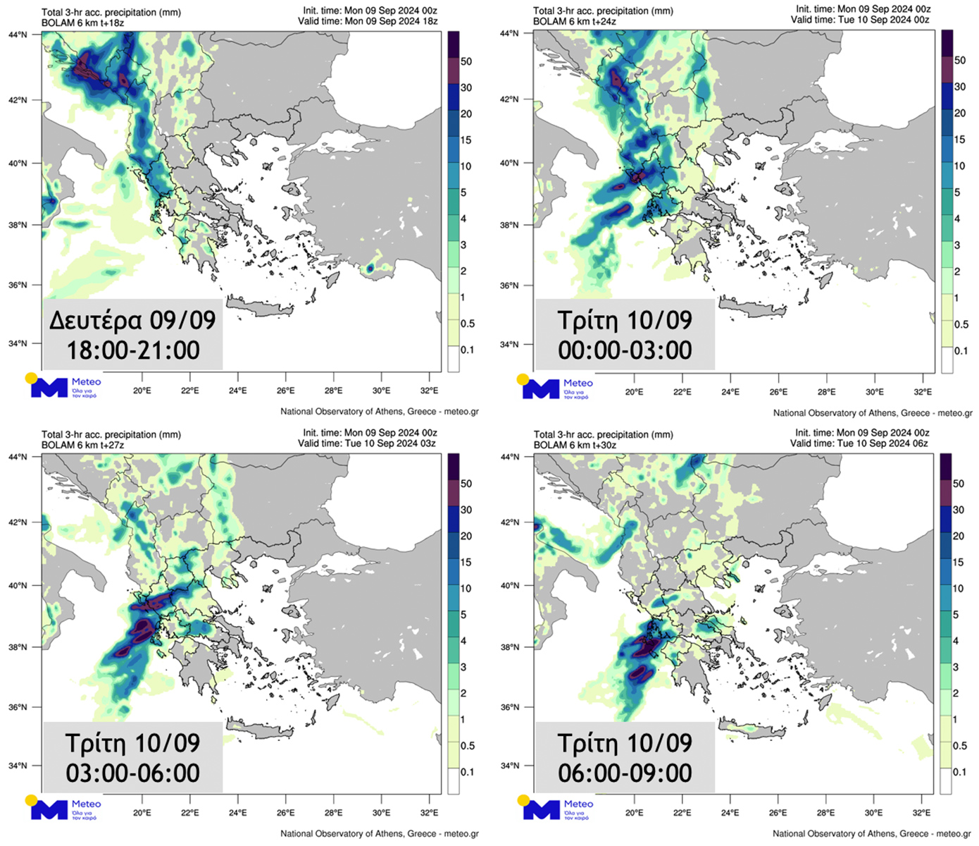 Στην παρακάτω ομάδα προγνωστικών χαρτών αποτυπώνεται ο εκτιμώμενος αθροιστικός υετός 3ώρου μεταξύ 18:00-21:00 της Δευτέρας 09/09, 00:00-03:00, 03:00-06:00 και 06:00-09:00 της Τρίτης 10/09.