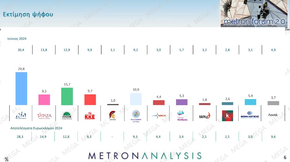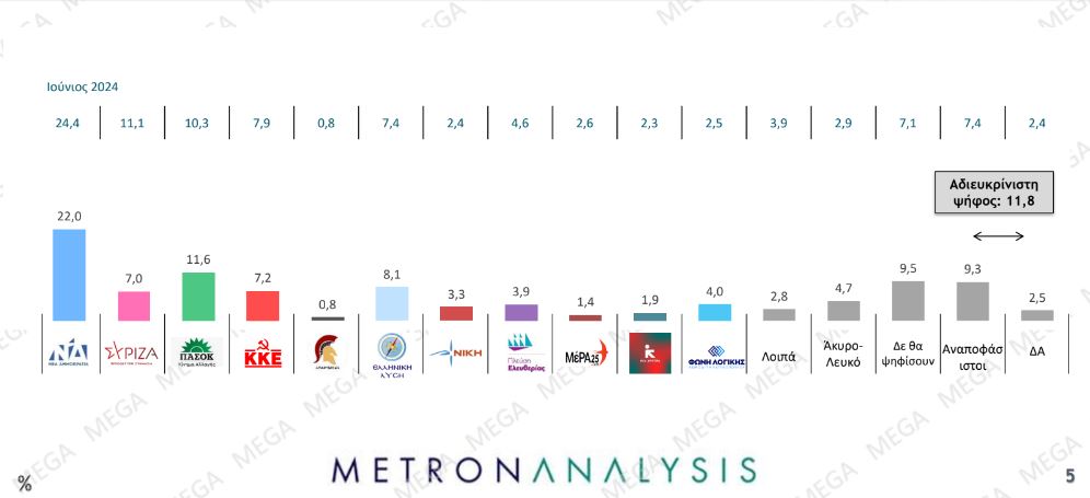 Συγκεκριμένα, στην πρόθεση ψήφου η Νέα Δημοκρατία καταγράφεται στο 22% και το ΠΑΣΟΚ ακολουθεί στο 11,6%. Τρίτο κόμμα εμφανίζεται η Ελληνική Λύση με 8,1% και τέταρτο το ΚΚΕ με 7,2%. Μόλις στην 5η θέση βρίσκεται ο ΣΥΡΙΖΑ με 7% και ακολουθούν η Φωνή Λογικής με 4%, η Πλεύση Ελευθερίας με 3,9%, η Νίκη με 3,3% και κάτω από το όριο εκπροσώπησης στη Βουλή η Νέα Αριστερά με 1,9% και το ΜέΡΑ25 με 1,4%.