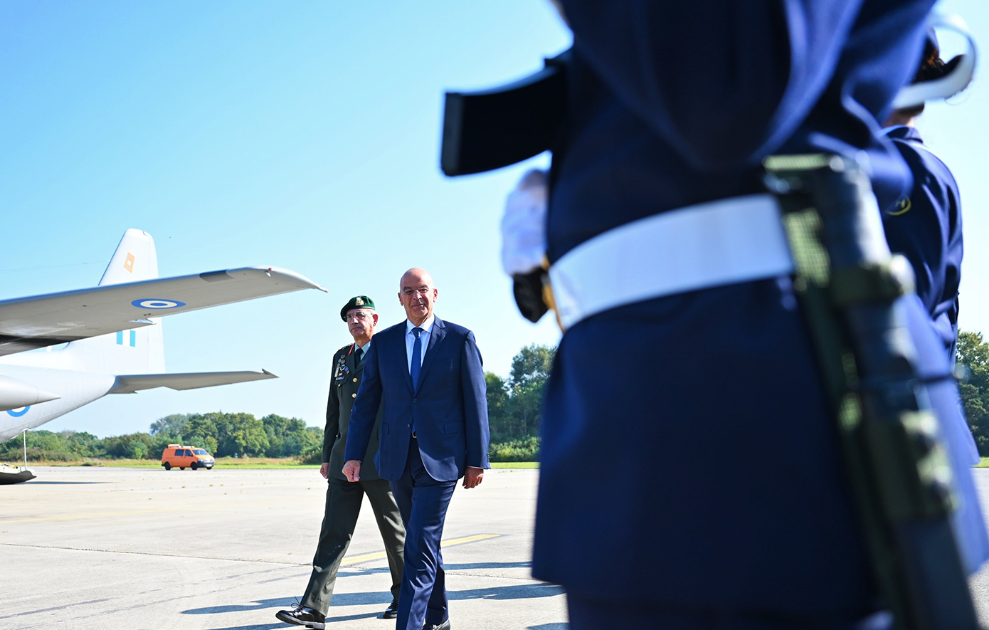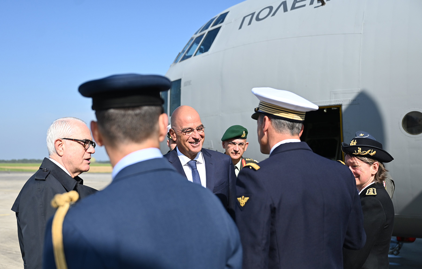 Άφιξη στην Αεροπορική Βάση της Lann-Bihoué στη Γαλλία, όπου πραγματοποιήθηκε επίσημη υποδοχή από τις γαλλικές αρχές, πριν από τη μετάβαση στα Ναυπηγεία της Navalgroup στη Lorient, για την τελετή καθέλκυσης της νέας Φρεγάτας FDI ΗΝ «Νέαρχος».