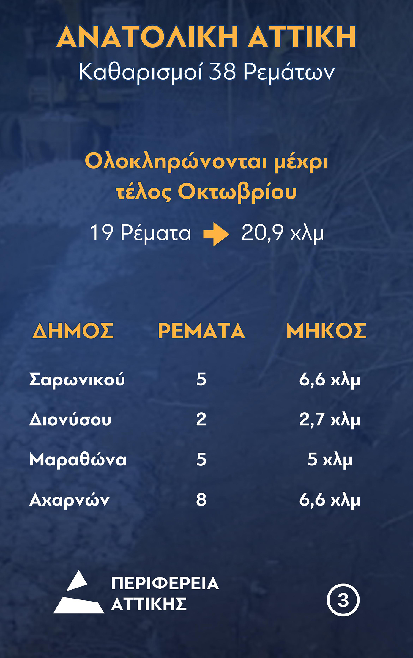 Παράλληλα, έως τα τέλη Οκτωβρίου θα έχουν ολοκληρωθεί ακόμη 19 καθαρισμοί ρεμάτων στην Ανατολική Αττική σε σχεδόν 20,9 χλμ., σε περιοχές υψηλής επικινδυνότητας, πάντα σε στενή συνεργασία με τους Δήμους και με τα συνεργεία μας να παρεμβαίνουν άμεσα όπου υπάρχει ανάγκη. Συνεχίζονται επίσης με ταχείς ρυθμούς οι εργασίες και στα πλακοσκεπή τμήματα στον Κηφισό, στον Ποδονίφτη και στα υπόλοιπα ποτάμια στο Λεκανοπέδιο.