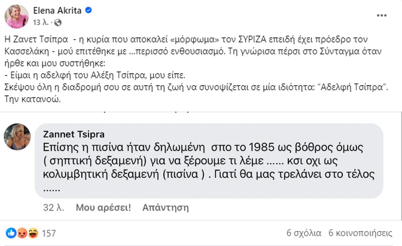 Ανάμεσα σε αυτούς που σχολίασαν την ανάρτηση ήταν και η Ζανέτ Τσίπρα, με την Έλενα Ακρίτα να της απαντά: