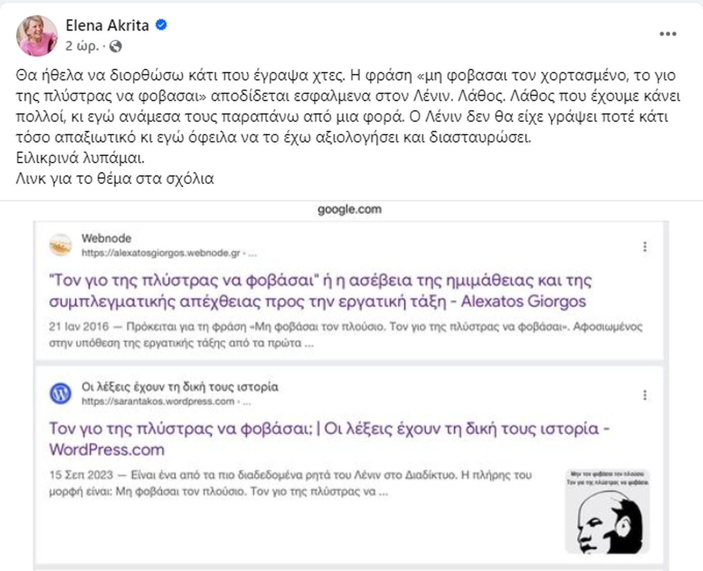 Σε προηγούμενη ανάρτησή της για το θέμα σημείωνε: «Θα ήθελα να διορθώσω κάτι που έγραψα χτες. Η φράση «μη φοβασαι τον χορτασμένο, το γιο της πλύστρας να φοβασαι» αποδίδεται εσφαλμενα στον Λένιν. Λάθος. Λάθος που έχουμε κάνει πολλοί, κι εγώ ανάμεσα τους παραπάνω από μια φορά. Ο Λένιν δεν θα είχε γράψει ποτέ κάτι τόσο απαξιωτικό κι εγώ όφειλα να το έχω αξιολογήσει και διασταυρώσει.