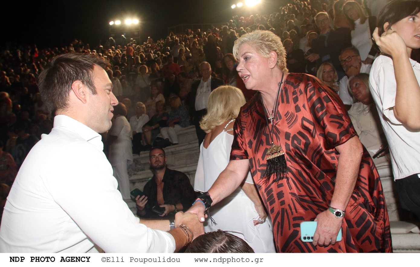 Ο Στέφανος Κασσελάκης είχε την ευκαιρία να χαιρετήσει την πρόεδρο της Πλεύσης Ελευθερίας, Ζωή Κωνσταντοπούλου, που βρέθηκε μαζί με τη μητέρα της στην παράσταση, ενώ αντάλλαξε θερμή χειραψία και με τη χήρα του Ανδρέα Παπανδρέου, Δήμητρα Λιάνη.