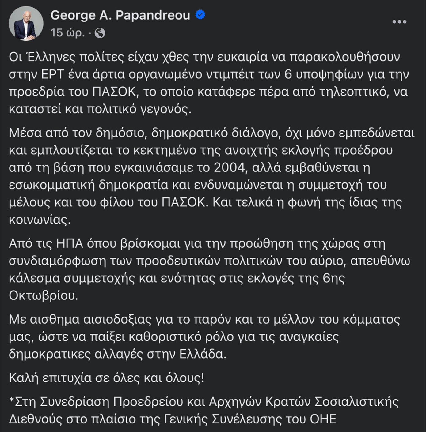 Κάλεσμα στους ψηφοφόρους του ΠΑΣΟΚ – ΚΙΝΑΛ για μαζική συμμετοχή στις εσωκομματικές εκλογές της 6ης Οκτωβρίου απευθύνει ο πρώην πρωθυπουργός και πάλαι ποτέ πρόεδρος του Κινήματος, Γιώργος Παπανδρέου. Από τις ΗΠΑ όπου και βρίσκεται για τη Συνεδρίαση Προεδρείου και Αρχηγών Κρατών Σοσιαλιστικής Διεθνούς στο πλαίσιο της Γενικής Συνέλευσης του ΟΗΕ, προέβη σε ανάρτηση στο Facebook αναφέροντας χαρακτηριστικά πως «απευθύνω κάλεσμα συμμετοχής και ενότητας στις εκλογές της 6ης Οκτωβρίου. Με αίσθημα αισιοδοξίας για το παρόν και το μέλλον του κόμματος μας, ώστε να παίξει καθοριστικό ρόλο για τις αναγκαίες δημοκρατικές αλλαγές στην Ελλάδα».