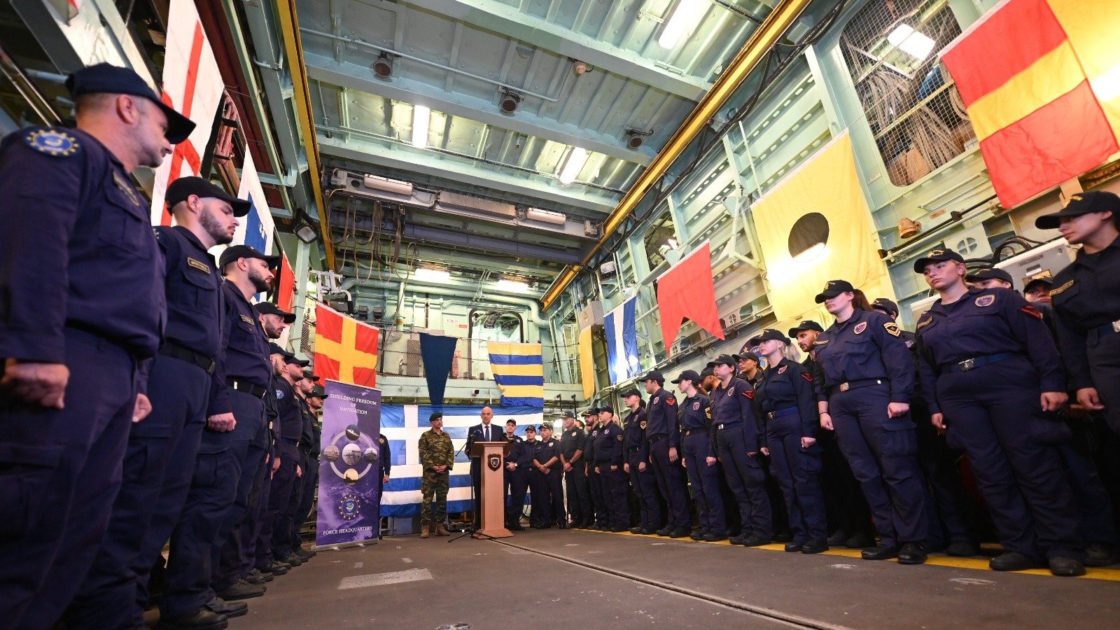 Ο κ. Δένδιας μετά την ολοκλήρωση της ενημέρωσης απηύθυνε ομιλία προς τον κυβερνήτη, τα στελέχη και το πλήρωμα της φρεγάτας, επισημαίνοντας ότι «οι γεωπολιτικές εξελίξεις στην Ανατολική Μεσόγειο και στην Ερυθρά Θάλασσα καθιστούν απολύτως αναγκαία τη συνέχιση της Ευρωπαϊκής Επιχείρησης Ασπίδες».