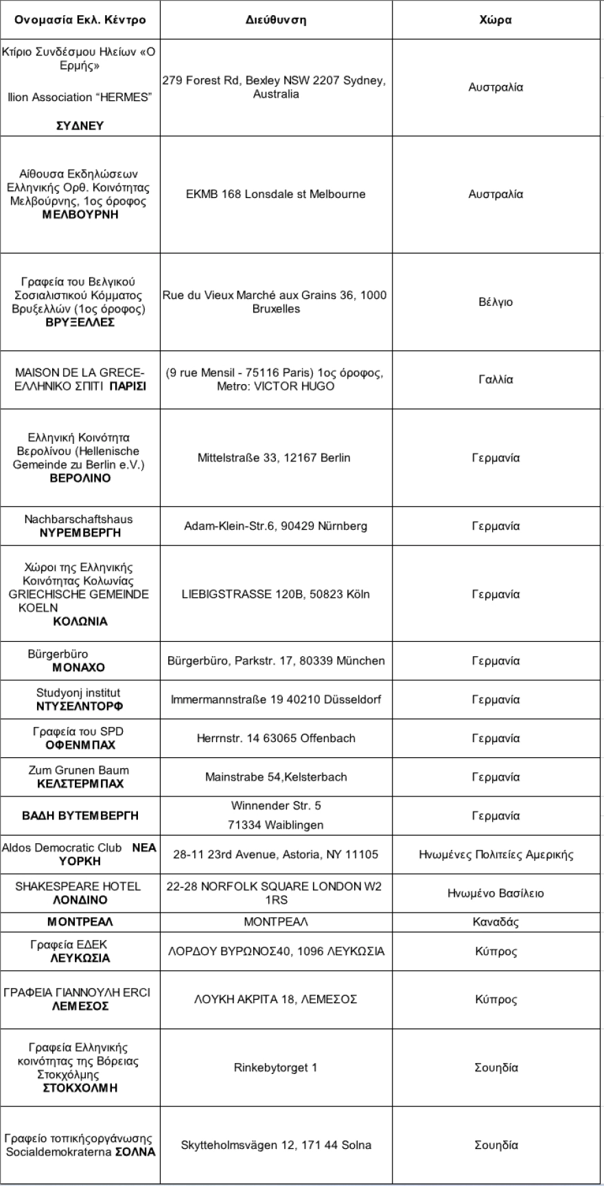Τα εκλογικά τμήματα εξωτερικού, σύμφωνα με πληροφορίες: