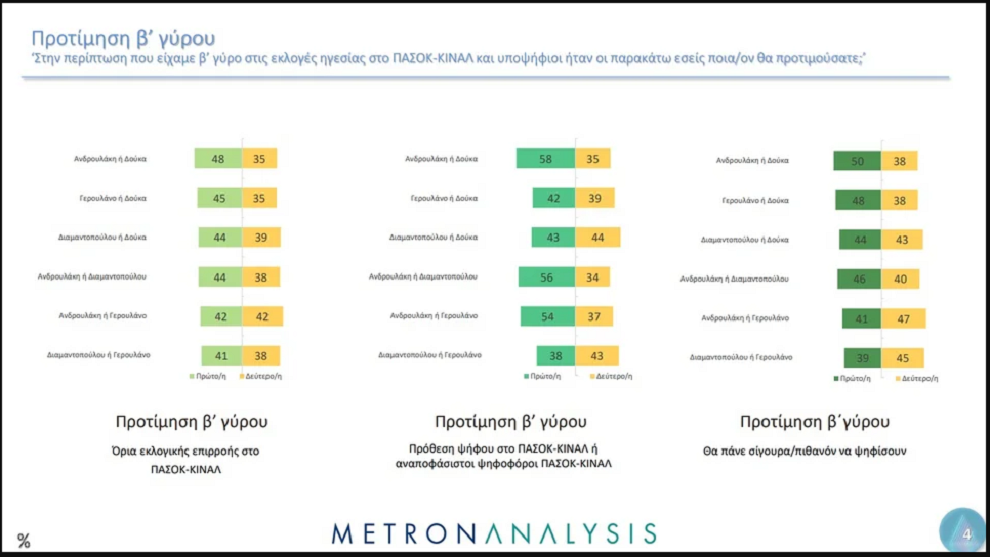 Ο Νίκος Ανδρουλάκης προηγείται με 24% και ακολουθεί η Άννα Διαμαντοπούλου με 22%, ενώ τρίτος εμφανίζεται ο Χάρης Δούκας με 20%.