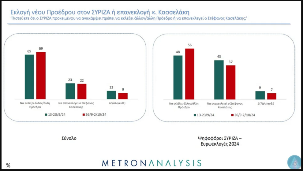Η Metron Analysis ρώτησε και για τις εκλογές στον ΣΥΡΙΖΑ, με την πλειοψηφία να προτείνει εκλογή νέου προέδρου και όχι επανεκλογή του Στέφανου Κασσελάκη.
