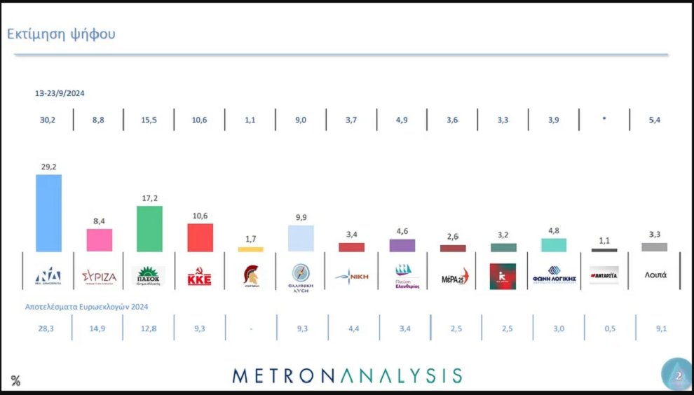 Η Metron Analysis παρουσίασε μια νέα δημοσκόπηση που δείχνει αλλαγές στο πολιτικό σκηνικό στην Ελλάδα, καθώς η Νέα Δημοκρατία παραμένει μεν πρώτη, αλλά το ΠΑΣΟΚ επιστρέφει και μάλιστα δυναμικά.