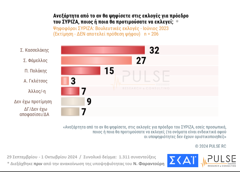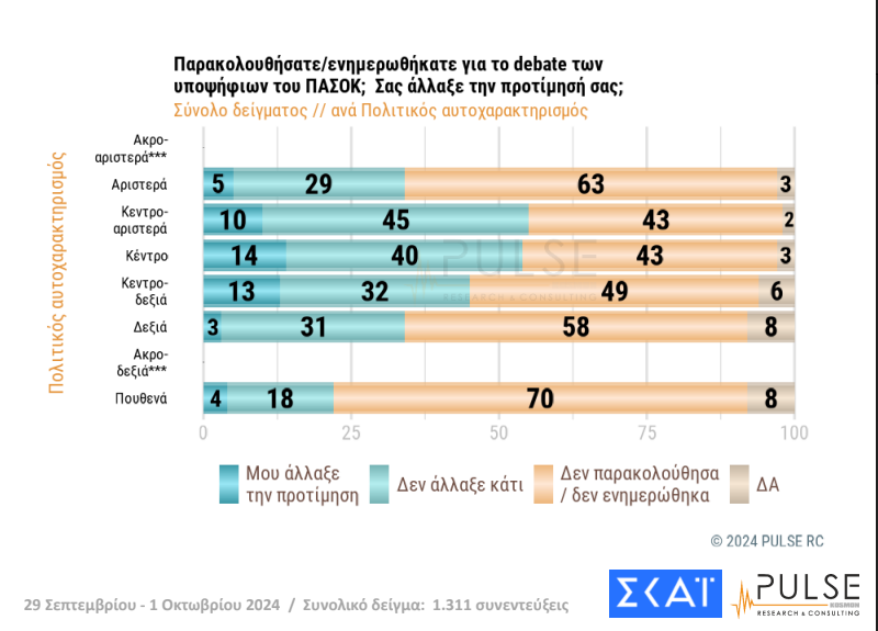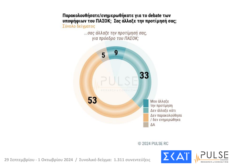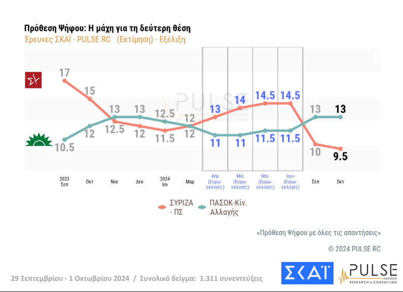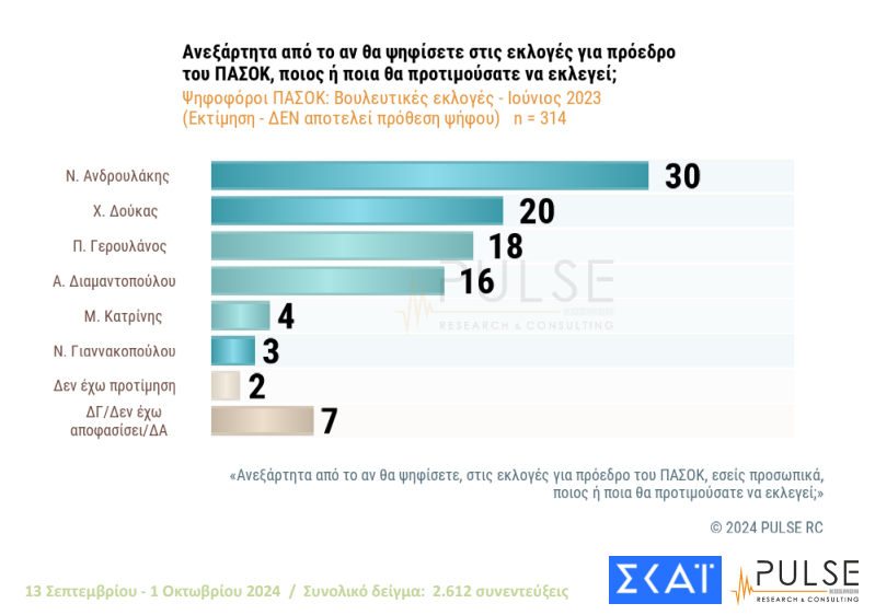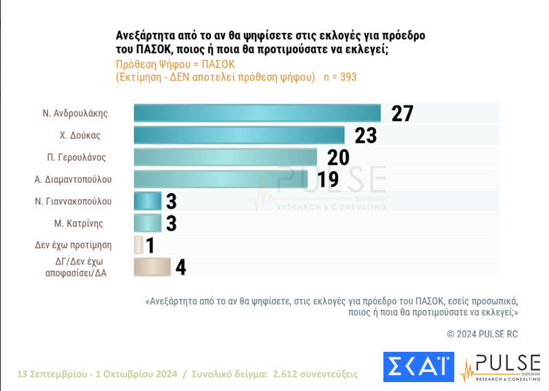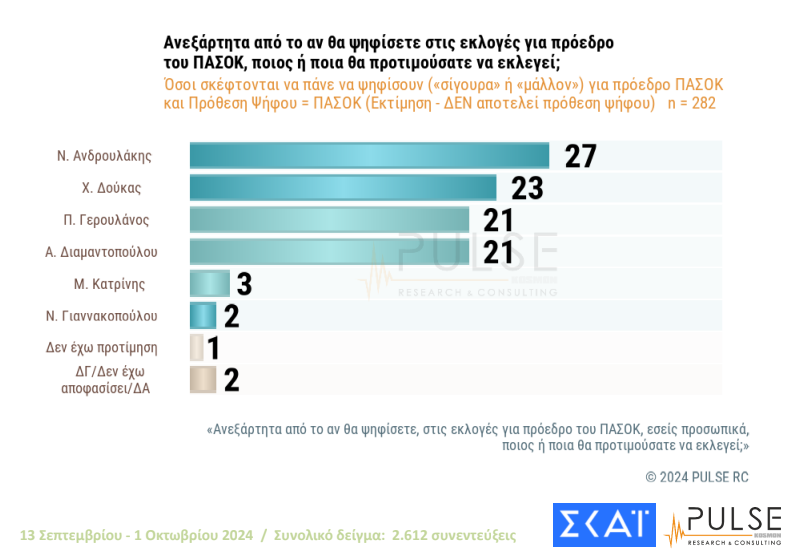 Μεγάλη δημοσκόπηση της Pulse παρουσιάστηκε στο κεντρικό δελτίο ειδήσεων του ΣΚΑΪ, η οποία δείχνει «ντέρμπι» στις εσωκομματικές εκλογές του ΠΑΣΟΚ, άνετη πρωτιά της Νέας Δημοκρατίας στην πρόθεση ψήφου και προβάδισμα Κασσελάκη για την προεδρία του ΣΥΡΙΖΑ