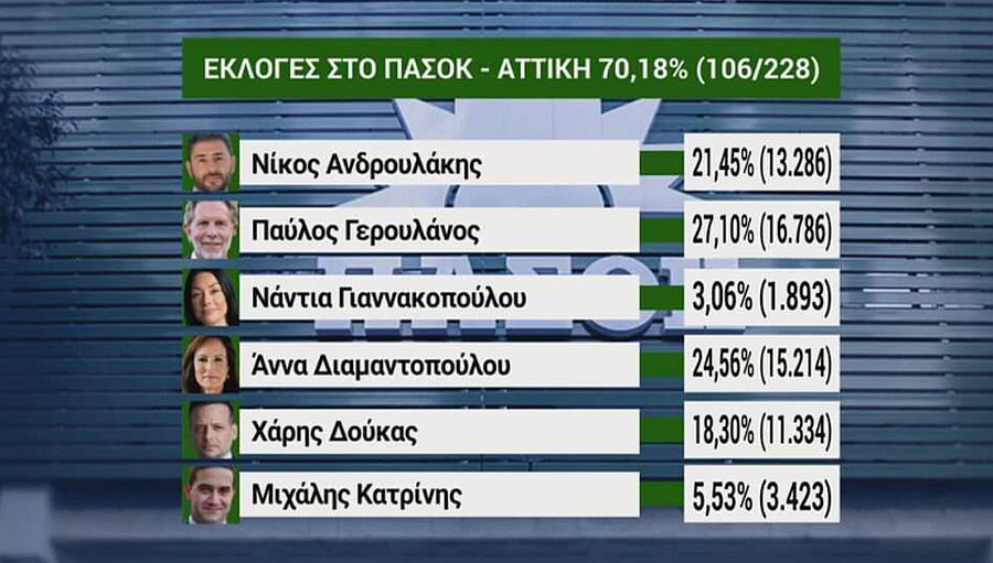 Με δεδομένο όμως ότι απομένει το 30% της ενσωμάτωσης στην Αττική όλα μπορούν να συμβούν. Ο Παύλος Γερουλάνος έχει μια δυναμική στην Αττική που συνεχώς ανεβάζει το ποσοστό του ενώ αντίθετα ο Χάρης Δούκας βρίσκεται στην τέταρτη θέση με διαφορά περίπου 5.000 ψήφων από τον κ. Γερουλάνο, χωρίς να δείχνει κάποια τάση να ανεβαίνει.