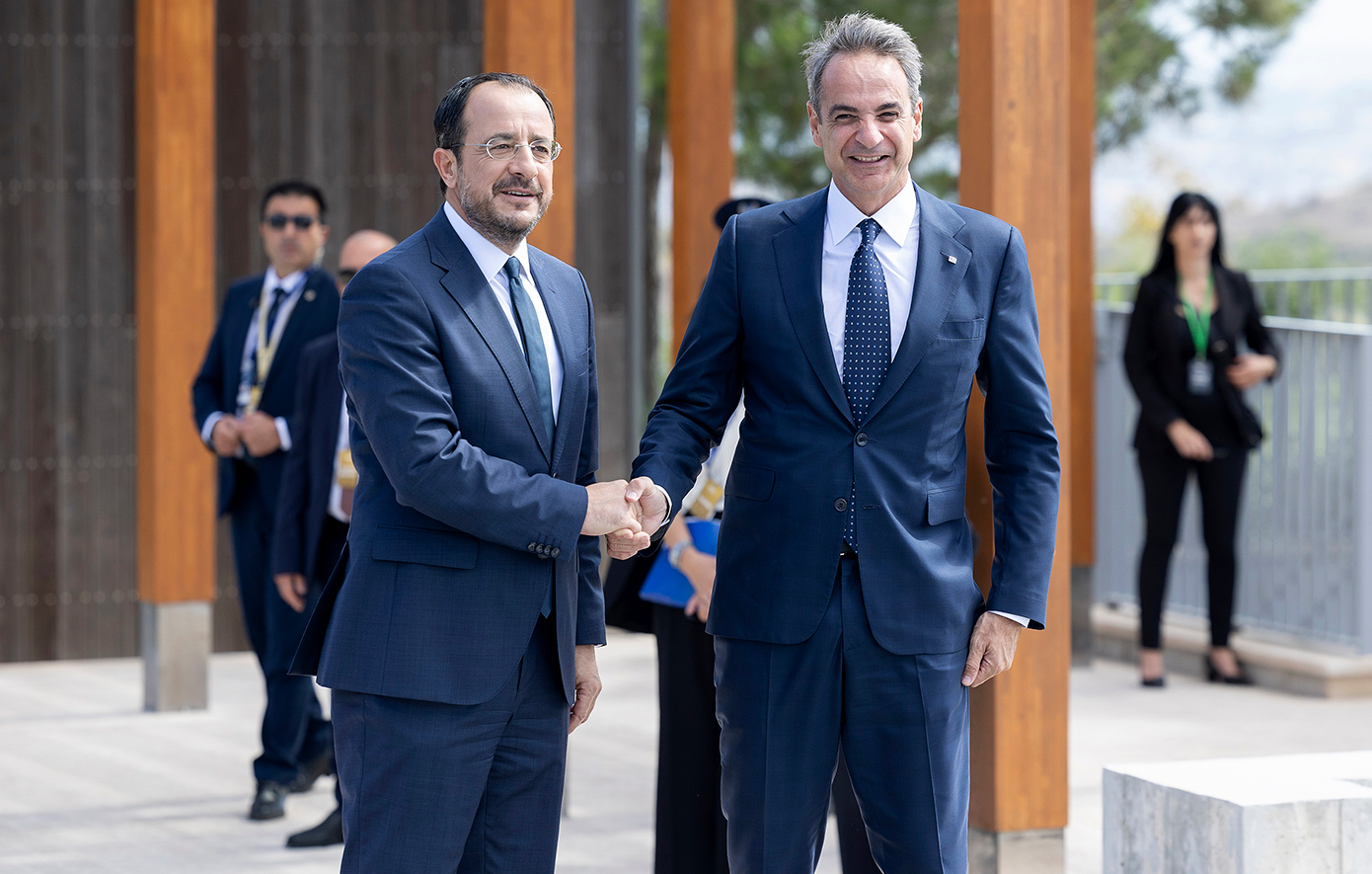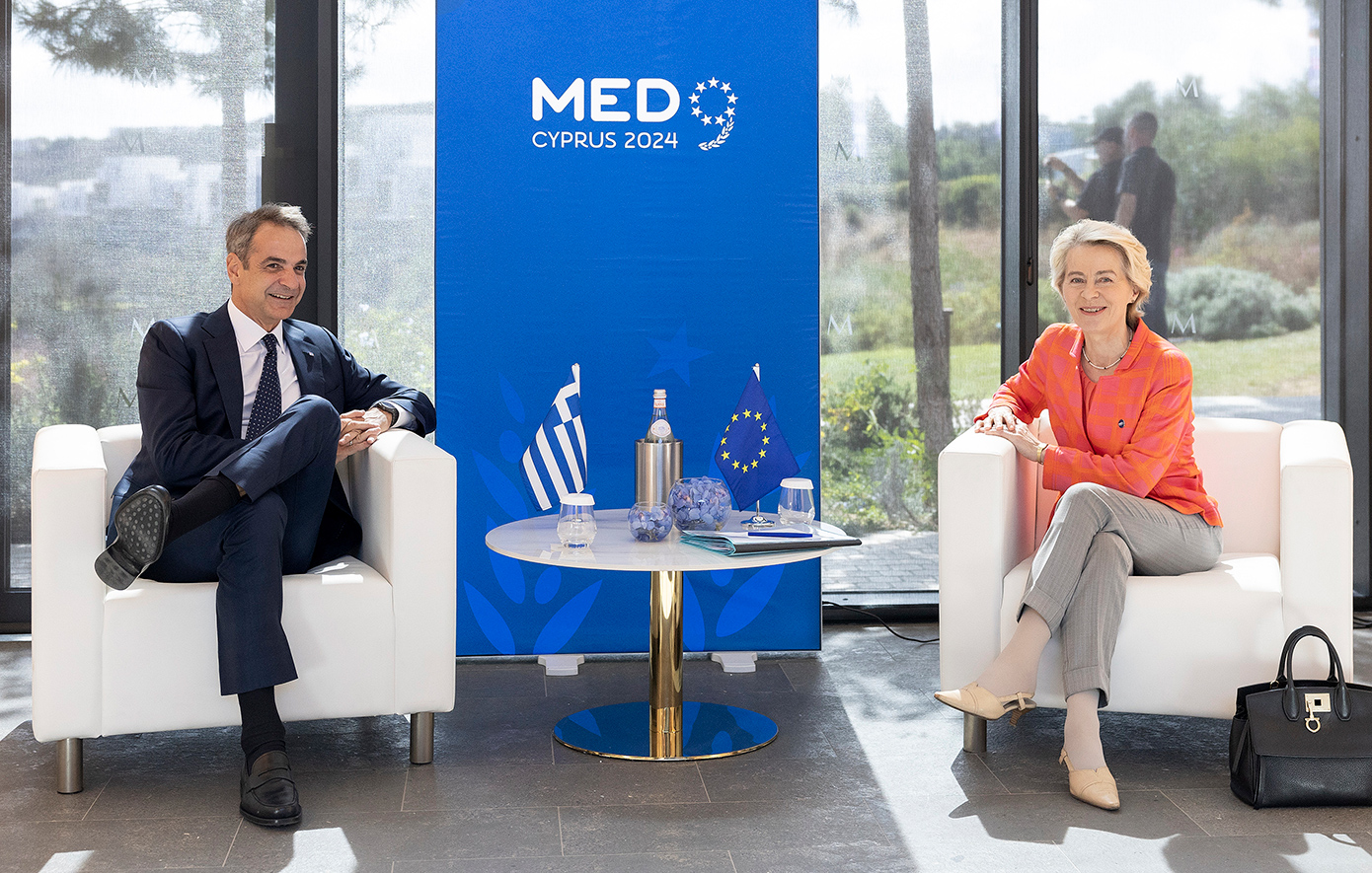 O πρωθυπουργός Κυριάκος Μητσοτάκης συναντήθηκε, πριν την έναρξη των εργασιών της Συνόδου Κορυφής MED9 στην Πάφο, με την πρόεδρο της Ευρωπαϊκής Επιτροπής Ursula von der Leyen.