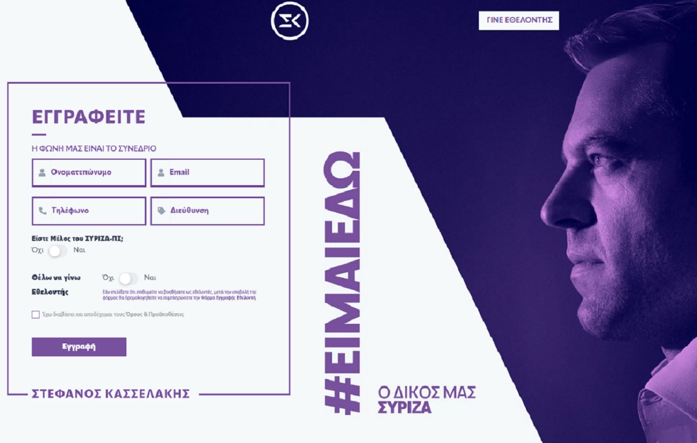 Η σελίδα περιλαμβάνει συνδέσμους για τη φόρμα εγγραφής εθελοντή, ενώ ζητούνται και τα στοιχεία του χρήστη. Ο χρήστης έχει επιλογή να δηλώσει αν είναι μέλος του ΣΥΡΙΖΑ και αν ναι σε ποια Οργάνωση Μελών.