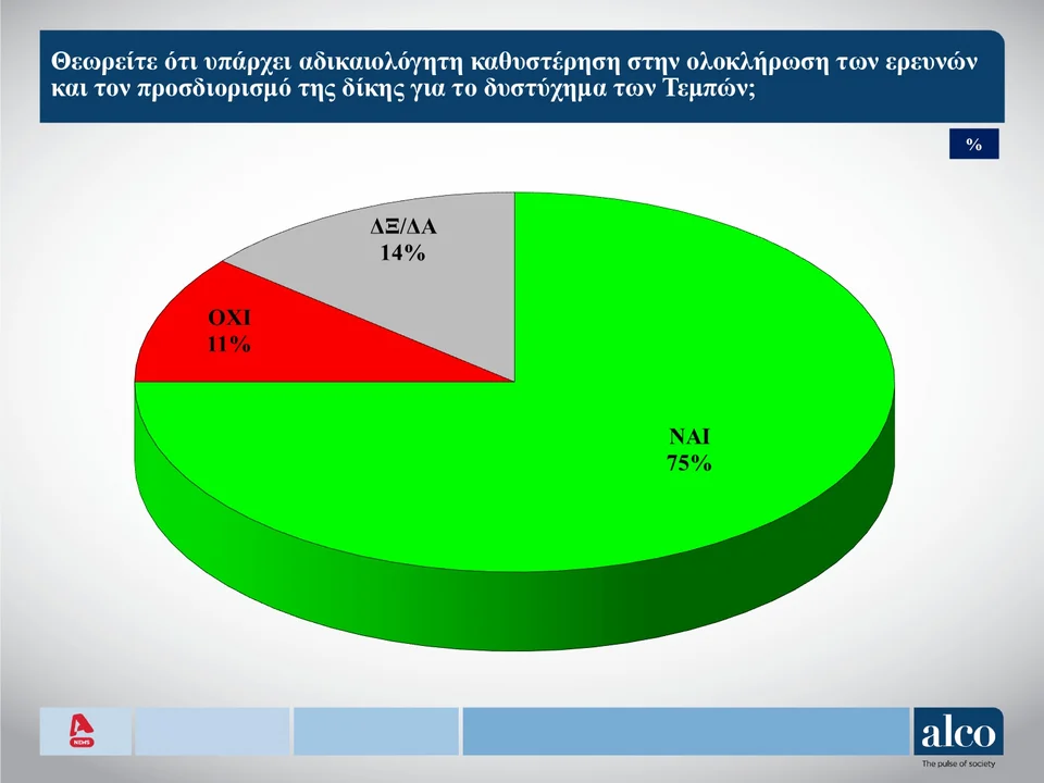 Τέλος, το 75% θεωρεί αδικαιολόγητη την καθυστέρηση στην ολοκλήρωση των ερευνών για το δυστύχημα των Τεμπών.