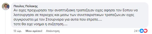 «Αν είχες προχωρήσει την αναπτυξιακή τράπεζα, αν είχες αφήσει τον ΕΟΠΥΥ να λειτουργήσει σε περιοχές και μέσω των συνεταιριστικών τραπεζών, αν είχες συγκρουστεί με τον Στουρνάρα για αυτά που έπρεπε….. τότε θα είχε νόημα η συζήτηση…».