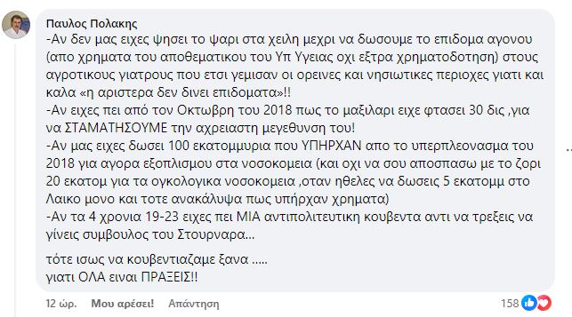 «-Αν δεν μας είχες ψήσει το ψάρι στα χείλη μέχρι να δώσουμε το επίδομα άγονου (από χρήματα του αποθεματικού του υπουργείου Υγείας, όχι έξτρα χρηματοδότηση) στους αγροτικούς γιατρούς που έτσι γέμισαν οι ορεινές και νησιωτικές περιοχές γιατί και καλά «η αριστερά δεν δίνει επιδόματα»!!