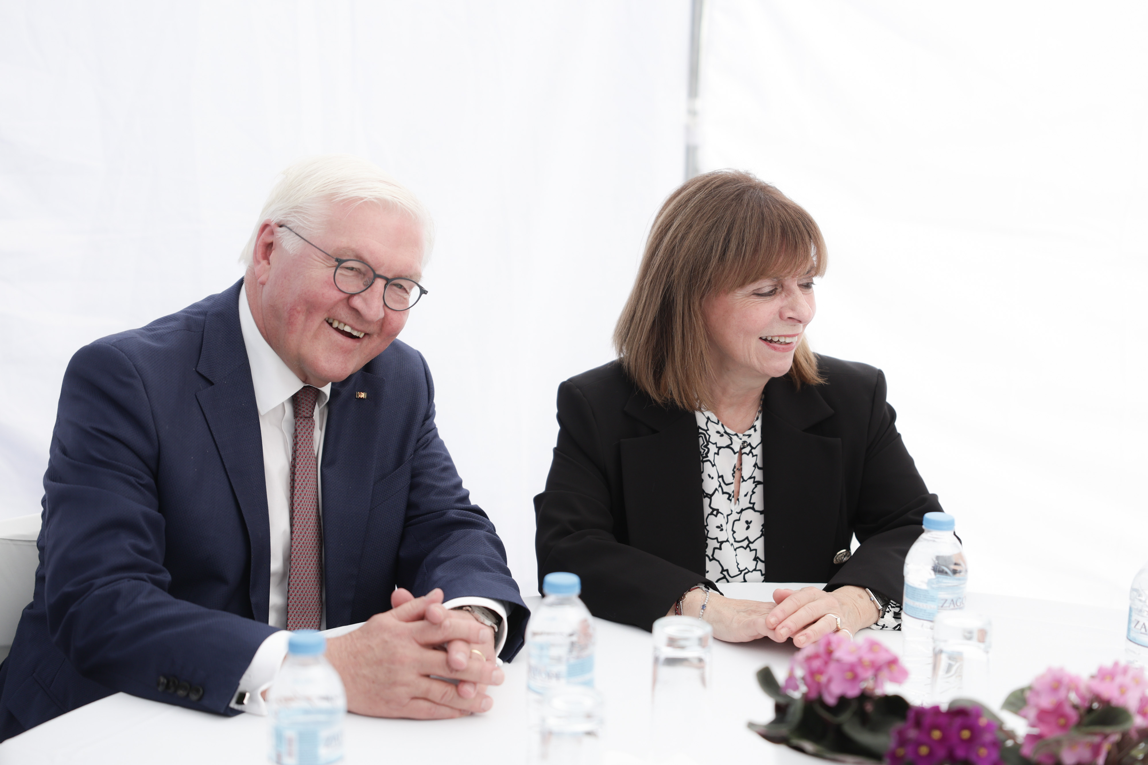 Με το που έφτασαν στον χώρο οι δύο Πρόεδροι συναντήθηκαν με τις επιζήσασες από το Ολοκαύτωμα Ρίνα Ρεβάχ και Ρόζη Σαλτιέλ, 85 και 89 ετών, αντίστοιχα, και είχαν μια ανθρώπινη συζήτηση μαζί τους. Όπως είπε στο ΑΠΕ-ΜΠΕ η κ. Ρεβάχ, ο κ. Σταϊνμάγερ θέλησε να μάθει από την ίδια και την κ. Σαλτιέλ την ιστορία τους- πού εκτοπίστηκαν, τις συνθήκες κράτησής τους κ.ά. ενώ εξέφρασε την ικανοποίησή του για το γεγονός ότι το Μουσείο Ολοκαυτώματος Ελλάδος έχει μπει πια σε τροχιά υλοποίησης.