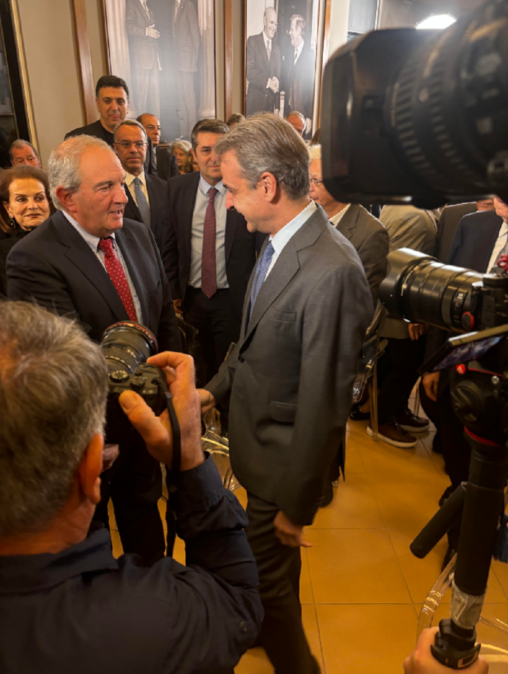 Ο Κυριάκος Μητσοτάκης έφτασε λίγο μετά τις 19:30 το απόγευμα, ευδιάθετος και αντάλλαξε χειραψία με τους δύο πρώην πρωθυπουργούς, στην πρώτη τους δημόσια συνάντηση από τον περασμένο Απρίλιο.