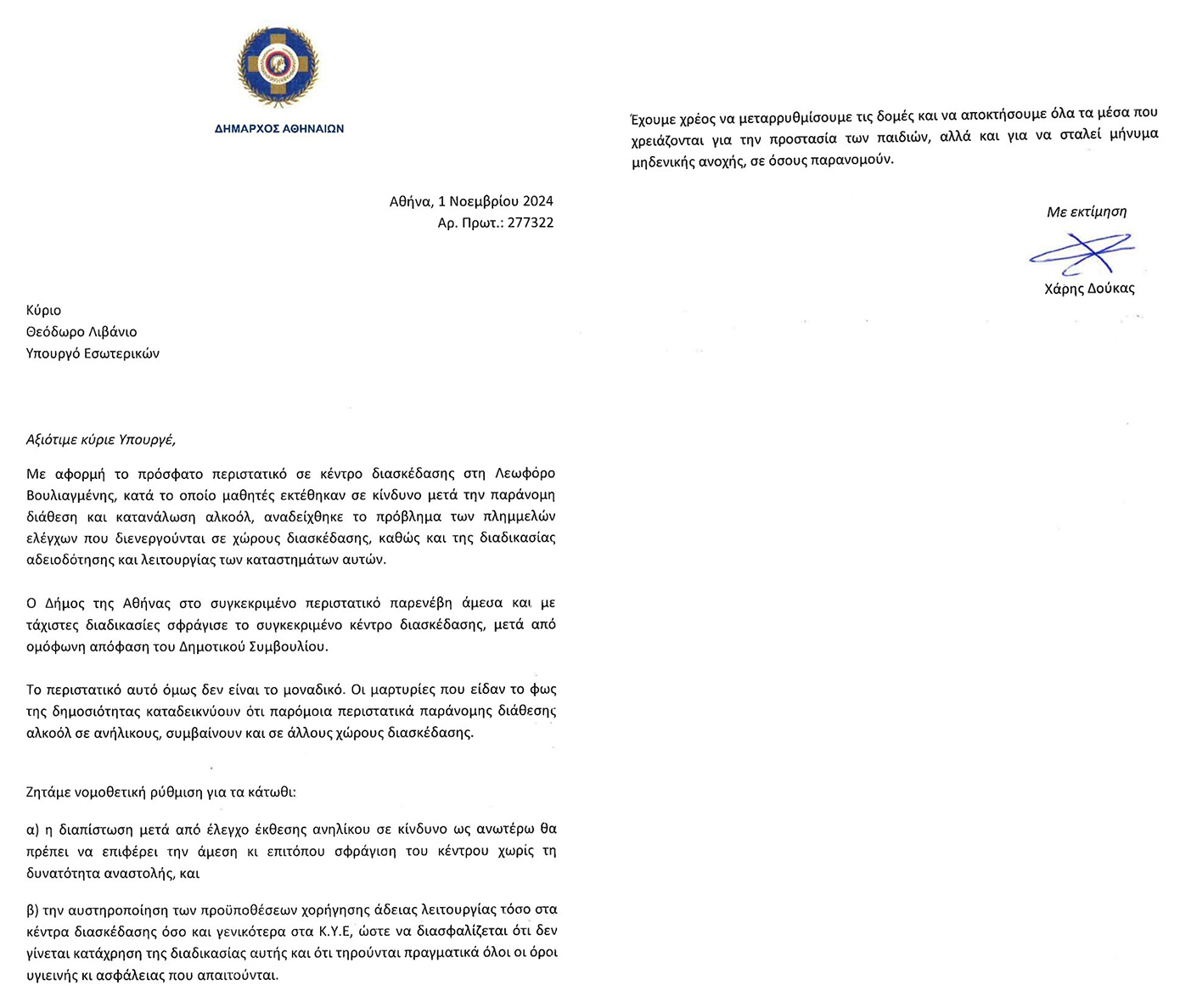Επιστολή στον υπουργό Εσωτερικών, Θεόδωρο Λιβάνιο, σχετικά με το πρόσφατο περιστατικό σε κέντρο διασκέδασης επί της Λεωφόρου Βουλιαγμένης, απέστειλε το Σάββατο 2 Νοεμβρίου 2024, ο δήμαρχος Αθηναίων, Χάρης Δούκας.