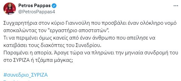 Ο Πέτρος Παππάς απάντησε με ανάρτησή του στο X, αναρωτώμενος αν ο Χρήστος Γιαννούλης «πληρώνει τη συνδρομή του ή τζάμπα μάγκας;». Συγκεκριμένα, ανέφερε στην ανάρτησή του: