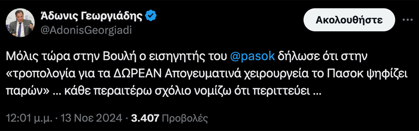 Όπως γράφει: «Μόλις τώρα στη Βουλή ο εισηγητής του @pasok δήλωσε ότι στην «τροπολογία για τα ΔΩΡΕΑΝ Απογευματινά χειρουργεία το ΠΑΣΟΚ ψηφίζει παρών»… κάθε περαιτέρω σχόλιο νομίζω ότι περιττεύει…».