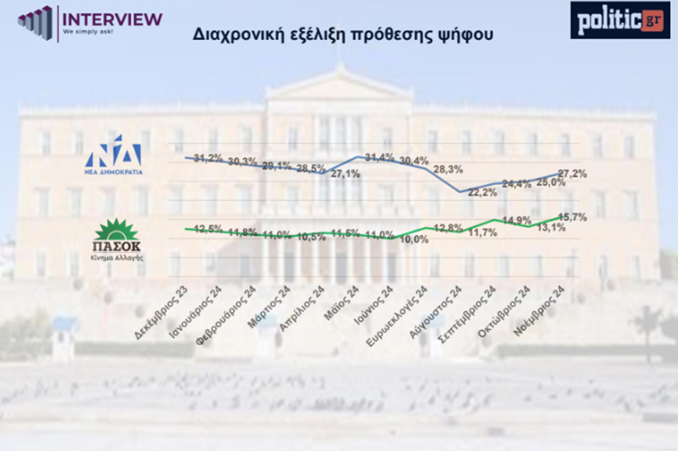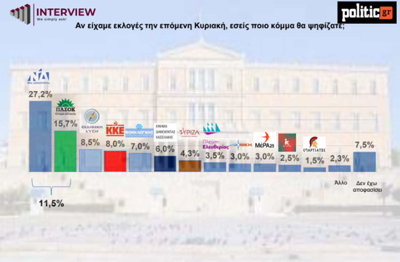 Σε ανοδική τροχιά κινούνται ΝΔ και ΠΑΣΟΚ καθώς σύμφωνα με την δημοσκόπηση της Interview για την POLITIC, ενώ στο 6% βρίσκεται το νέο κόμμα του Στέφανου Κασσελάκη, Κίνημα Δημοκρατίας.