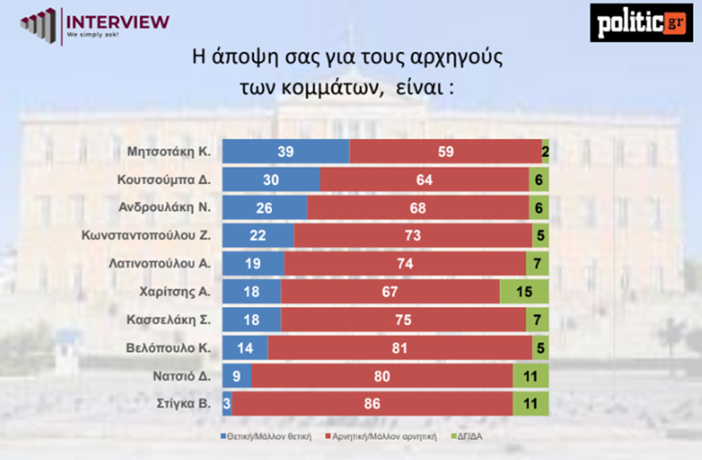 Στις δημοφιλίες των πολιτικών αρχηγών, ο Κυριάκος Μητσοτάκης προηγείται, και μάλιστα τόσο ο πρωθυπουργός όσο και ο Νίκος Ανδρουλάκης παρουσιάζουν αύξηση στα ποσοστά δημοφιλίας, σε σύγκριση με την έρευνα του προηγούμενου μήνα.