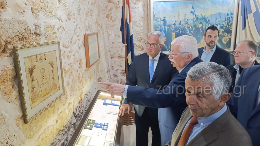 Ο υπουργός κ. Βορίδης, μαζί με τον περιφερειάρχη Κρήτης, Σταύρο Αρναουτάκη, τον αντιπεριφερειάρχη Χανίων, Νίκο Καλογερή, τον δήμαρχο Χανίων, Παναγιώτη Σημανδηράκη και τον διευθυντή του Εθνικού Ιδρύματος Ελευθέριου Βενιζέλου, Νικόλαο Παπαδάκη – Παπαδή, με ενωμένα τα χέρια ανέβηκαν στον προμαχώνα και ύψωσαν την ελληνική σημαία υπό τους ήχους της μπάντας των Ενόπλων Δυνάμεων της Μεραρχίας Χανίων.