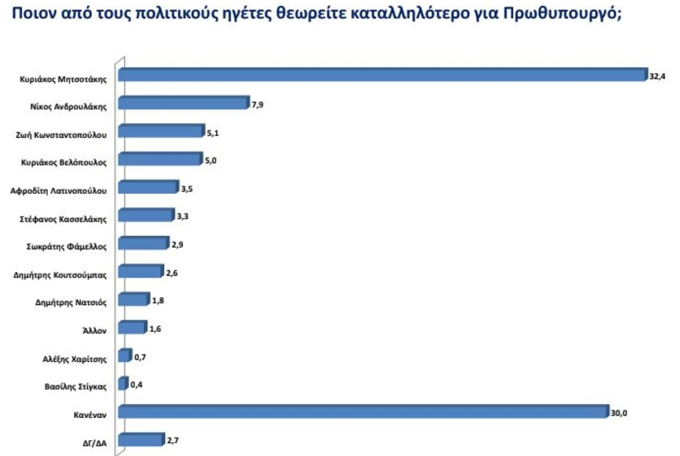 Καταλληλότερος πρωθυπουργός εμφανίζεται ο Κυριάκος Μητσοτάκης με 32,4% των προτιμήσεων. Ο δεύτερος Νίκος Ανδρουλάκη συγκεντρώνει μόλις 7,9%.