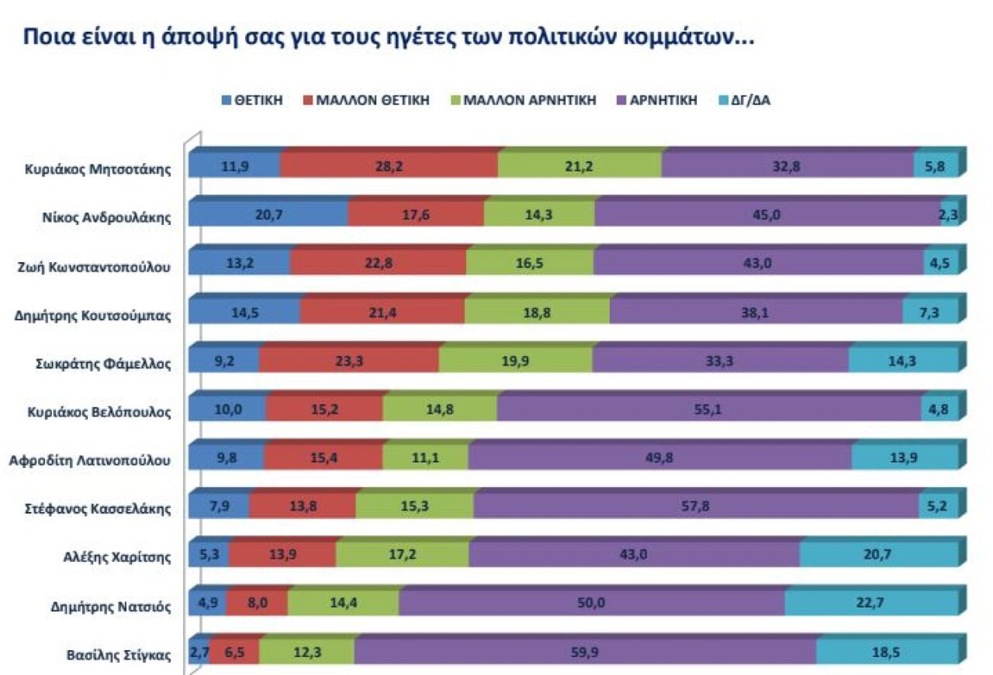 Ο Κυριάκος Μητσοτάκης, εμφανίζεται ως ο δημοφιλέστερος πολιτικός αρχηγός με θετική άποψη που φτάνει το 40,1%. Ακολουθούν Νίκος Ανδρουλάκης με 38,3%, Ζωή Κωνσταντοπούλου με 36%, Δημήτρης Κουτσούμπας με 35,9%, Σωκράτης Φάμελλος με 32,5%, Κυριάκος Βελόπουλος και Αφροδίτη Λατινοπούλου με 25,2%, Στέφανος Κασσελάκης με 21,7%, Αλέξης Χαρίτσης με 19,2%, Δημήτρης Νατσιός με 12,9% και Βασίλης Στίγκας με 9,2%.