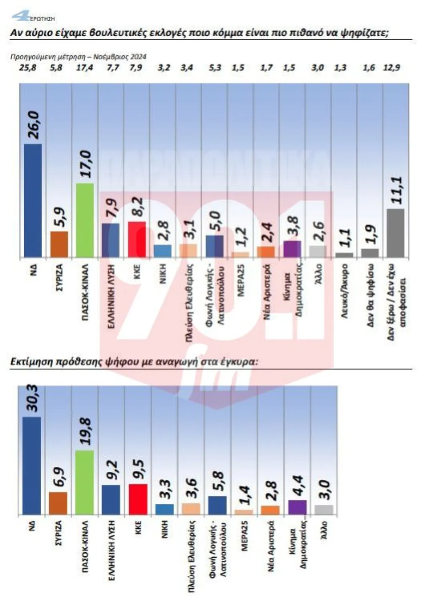 Η Νέα Δημοκρατία συγκεντρώνει ποσοστό 30,3% στην εκτίμηση ψήφου. Στη δεύτερη θέση με διαφορά 10,5 μονάδων βρίσκεται το ΠΑΣΟΚ (19,8%) και ακολουθούν ΚΚΕ με 9,5%, Ελληνική Λύση με 9,2%, ΣΥΡΙΖΑ με 6,9%, Φωνή Λογικής με 5,8%, Κίνημα Δημοκρατίας με 4,4%, Πλεύση Ελευθερίας με 3,6%, Νίκη με 3,3%, Νέα Αριστερά με 2,8% και ΜέΡΑ25 με 1,4%.