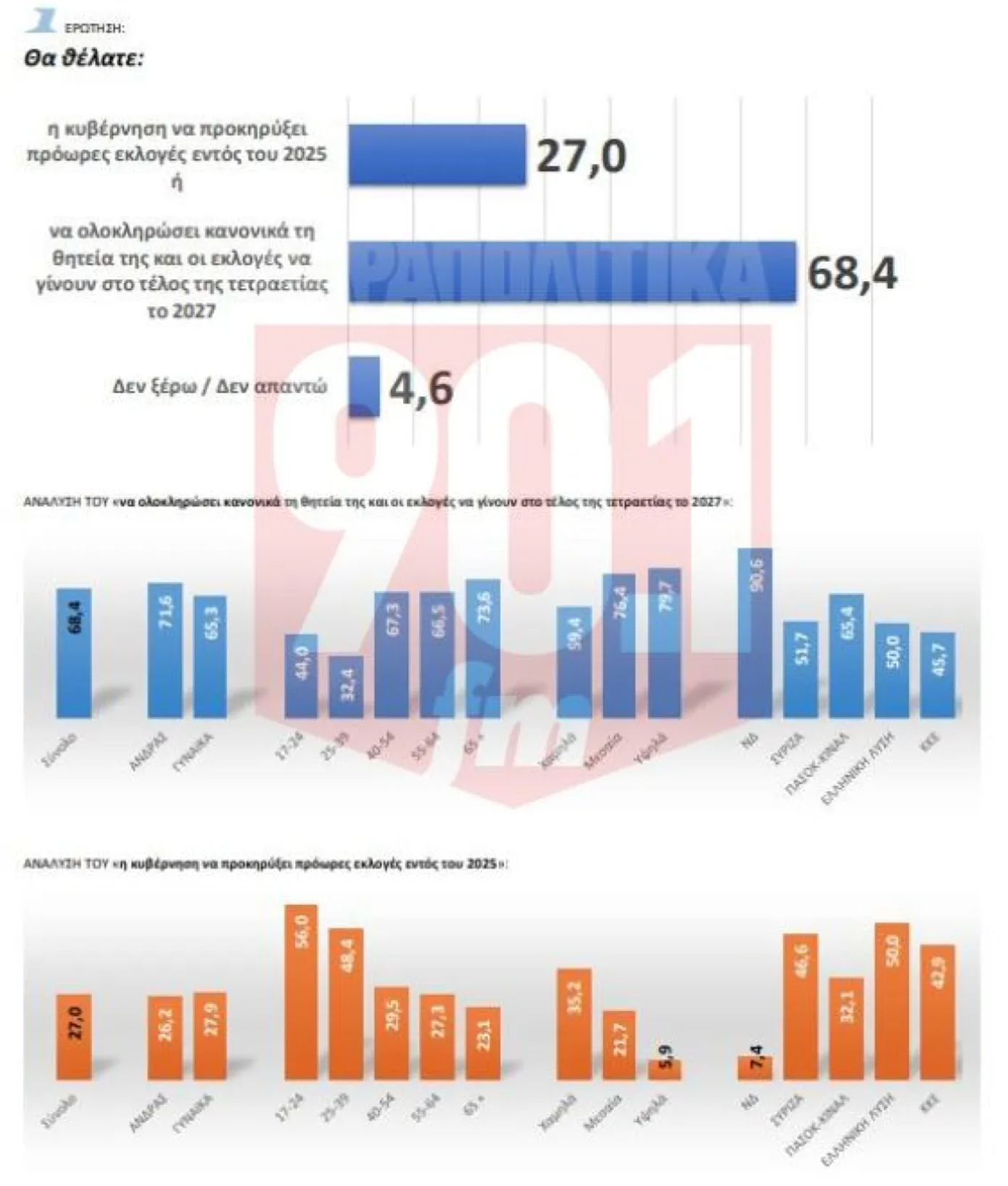 Το 68,4% της κοινής γνώμης επιθυμεί να ολοκληρωθεί η κυβερνητική θητεία και οι εκλογές να διεξαχθούν το 2027, σύμφωνα με την έρευνα. Υπέρ της πρόωρης προσφυγής στην κάλπη εντός του 2025 τάσσεται το 27% του πληθυσμού.