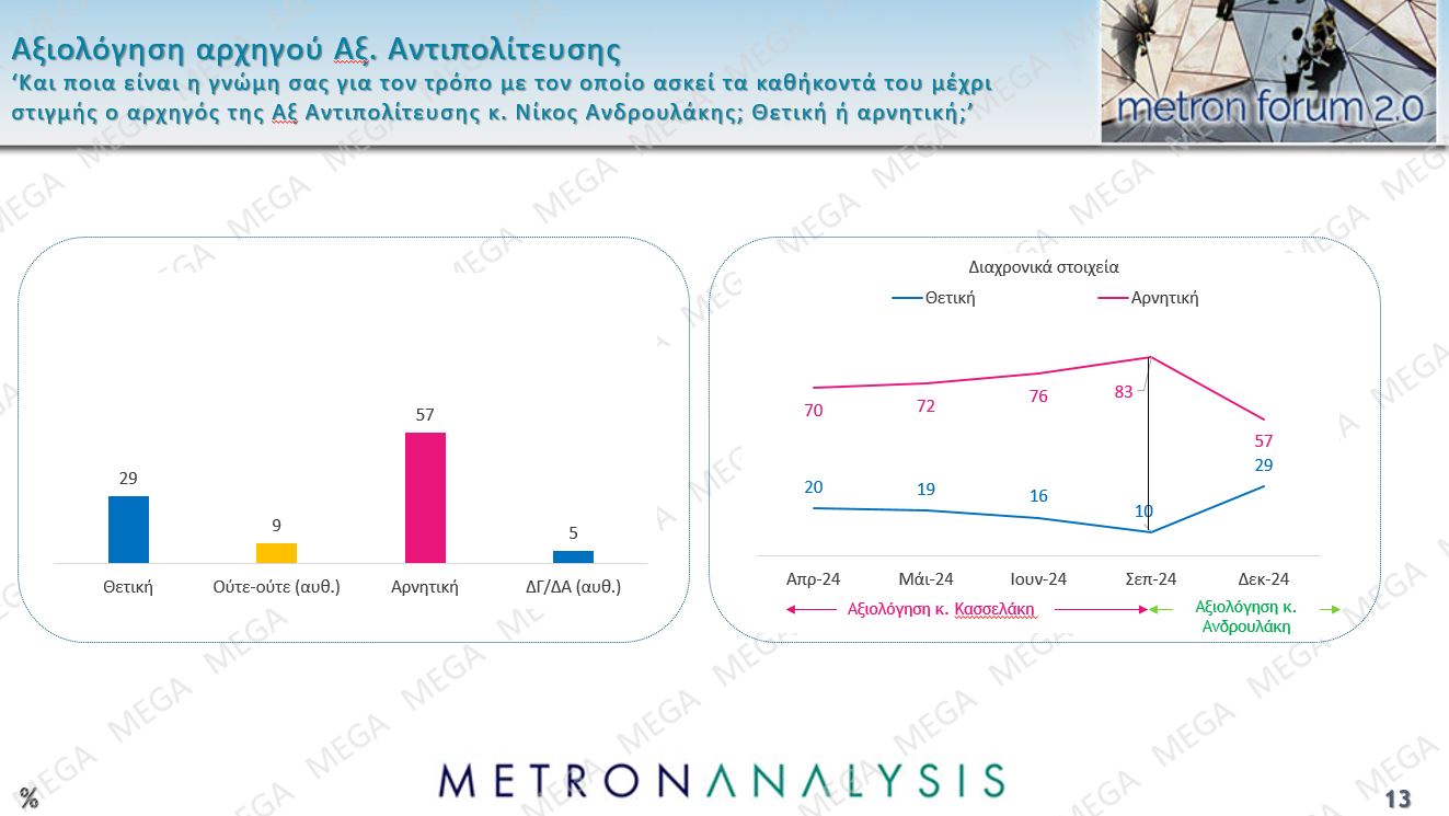 Σε ερώτημα για την αξιολόγηση του προέδρου του ΠΑΣΟΚ Νίκου Ανδρουλάκη, το 29% απαντά θετικά και το 57% αρνητικά, ενώ 9% δηλώνει πως έχει ούτε θετική, ούτε όμως και αρνητική εκτίμηση.
