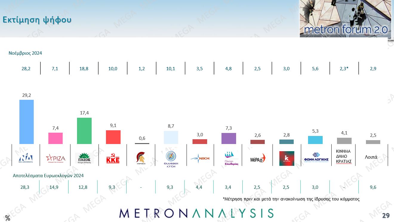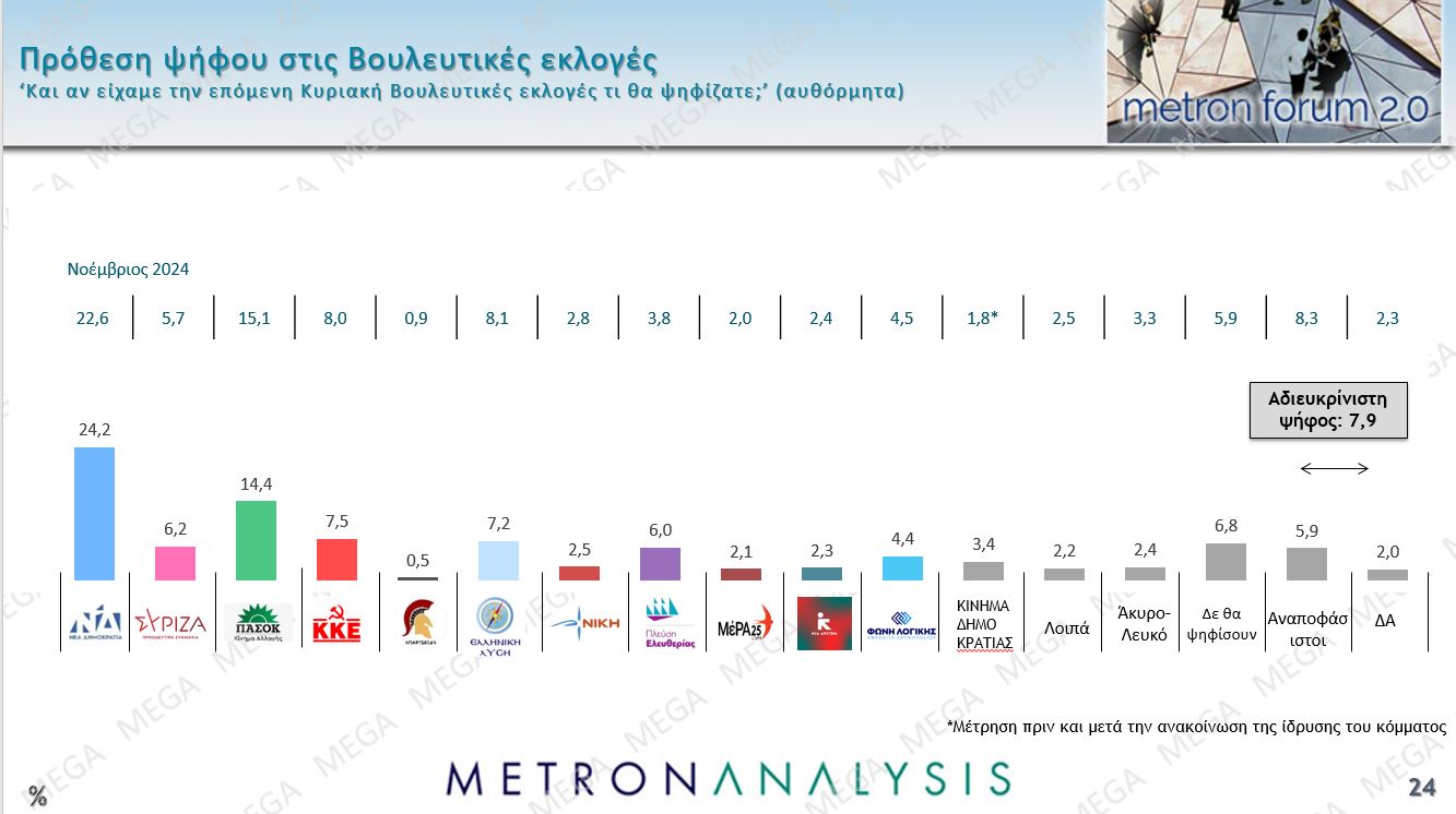 Στην πρόθεση ψήφου της έρευνας, η Νέα Δημοκρατία προηγείται με 24,2% και ακολουθεί το ΠΑΣΟΚ με 14,4%. Το ΚΚΕ βρίσκεται στην 3η θέση με 7,5% και ακολουθούν Ελληνική Λύση με 7,2%, ο ΣΥΡΙΖΑ με 6,2%, η Πλεύση Ελευθερίας με 6%, η Φωνή Λογικής με 4,4%, το Κίνημα Δημοκρατίας με 3,4%, η ΝΙΚΗ με 2,5%, η Νέα Αριστερά με 2,3%, το ΜέΡΑ25 2,1% και οι Σπαρτιάτες με 0,5%.