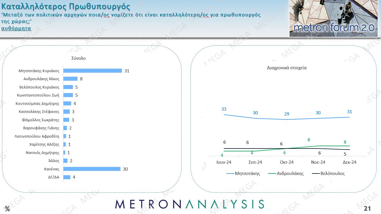 Στην καταλληλότητα για πρωθυπουργό, ο Κυριάκος Μητσοτάκης προηγείται με 31%, ακολουθούν ο Νίκος Ανδρουλάκης με 8%, ο Κυριάκος Βελόπουλος με 5%, η Ζωή Κωνσταντοπούλου με 5%, ο Δημήτρης Κουτσούμπας με 4%, ο Στέφανος Κασσελάκης με 3%, ο Σωκράτης Φάμελλος με 3%, ο Γιάνης Βαρουφάκης με 2% και οι Αφροδίτη Λατινοπούλου, Αλέξης Χαρίτσης και Δημήτρης Νατσιός με 1%.