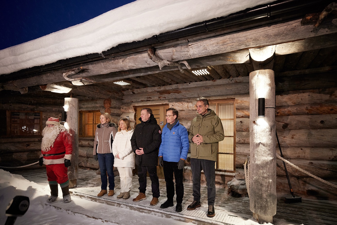 Κατά την υποδοχή του από τον Φινλανδό πρωθυπουργό Petteri Orpo, ο Κυριάκος Μητσοτάκης συνάντησε και τον Άγιο Βασίλη με τον οποίο αντάλλαξε χειραψία την ώρα που χιόνιζε πολύ μέσα στη νύχτα.