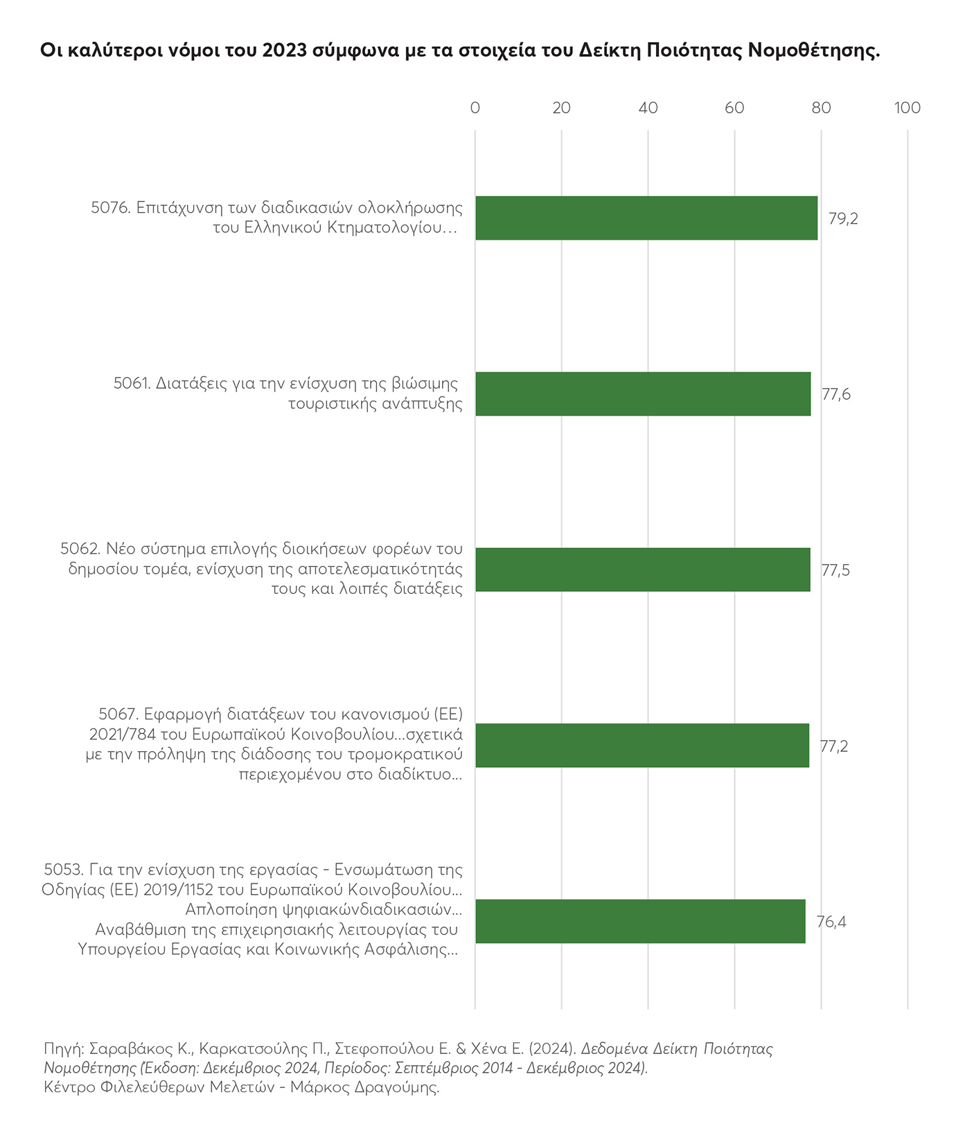 Με βάση, λοιπόν το ΚΕΦΙΜ, οι πέντε καλύτεροι νόμοι του 2023 σύμφωνα με τον Δείκτη Ποιότητας Νομοθέτησης ήταν: