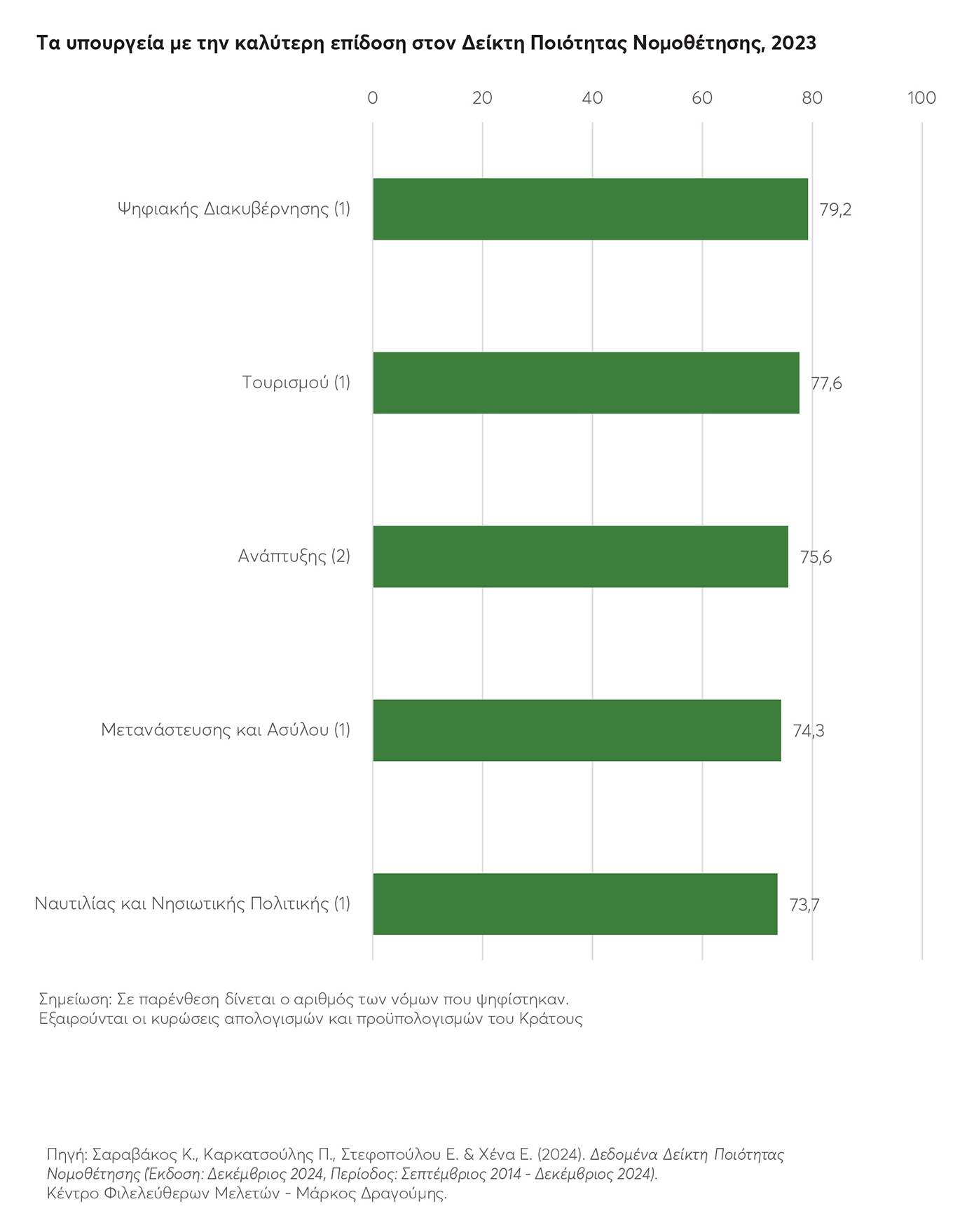 ● Το υπουργείο Μετανάστευσης και Ασύλου (1 ψηφισθείς νόμος το 2023) με μέση βαθμολογία 74,3 στα 100.