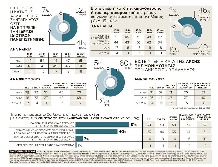 Την ίδια ώρα, η μεγάλη πλειοψηφία της κοινωνίας τάσσεται υπέρ της αναθεώρησης του άρθρου 16 του Συντάγματος και την ίδρυση ιδιωτικών πανεπιστημίων. Το 52% λέει «ναι» και το 41% λέει «όχι». Εδώ ο διαχωρισμός, όμως, είναι ξεκάθαρος. Υπέρ δηλώνει το 75% των ψηφοφόρων της Ν.Δ. και το 53% εκείνων του ΠΑΣΟΚ, κάτι που αναμένεται να δημιουργήσει πρόβλημα στον Νίκο Ανδρουλάκη, αν επιμείνει να κρατήσει τη στάση που επέλεξε στη θεσμοθέτηση των μη κρατικών ΑΕΙ. Αναμενόμενη η στάση των ψηφοφόρων του ΣΥΡΙΖΑ με το 73% να δηλώνουν αντίθετοι, όπως και των μικρών κομμάτων της Αριστεράς με 68%.