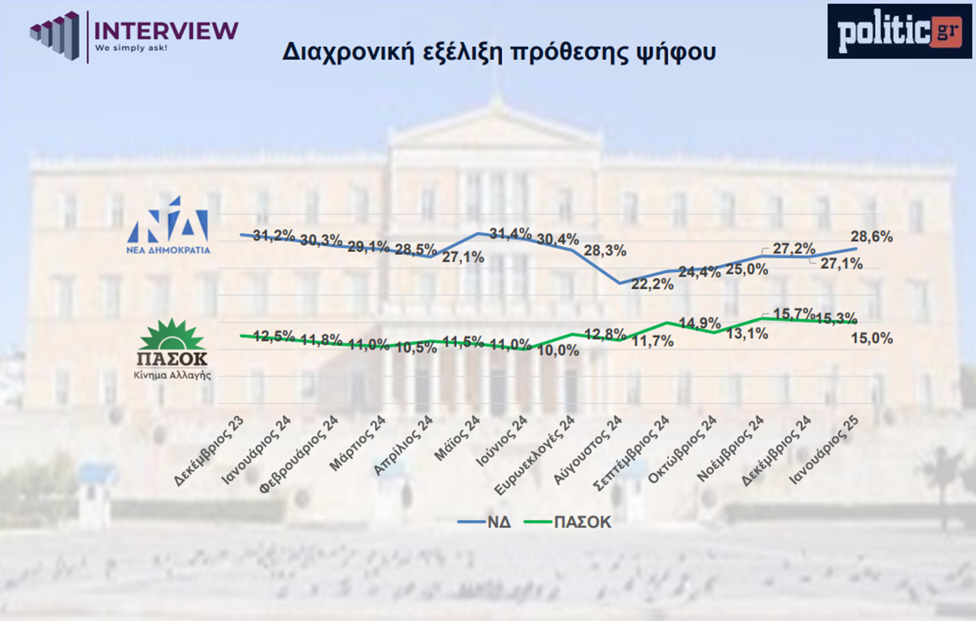 Η Νέα Δημοκρατία παραμένει στην πρώτη θέση των πολιτικών δυνάμεων στην πρόθεση ψήφου αν είχαμε εκλογές την επόμενη Κυριακή, με ποσοστό 28,6%, παρουσιάζοντας άνοδο σε σχέση με την προηγούμενη δημοσκόπηση, τον Δεκέμβριο του 2024 (27,1%). Το ΠΑΣΟΚ βρίσκεται στη δεύτερη θέση, αλλά σημειώνει πτώση σε διάστημα ενός μήνα από το 15,3% στο 15%. Παράλληλα, η Ελληνική Λύση παραμένει στην τρίτη θέση, ανεβάζοντας το ποσοστό της από 8% σε 8,2%, με το ΚΚΕ να διατηρεί στο ακέραιο τη δύναμή του (8%) στην τέταρτη θέση.