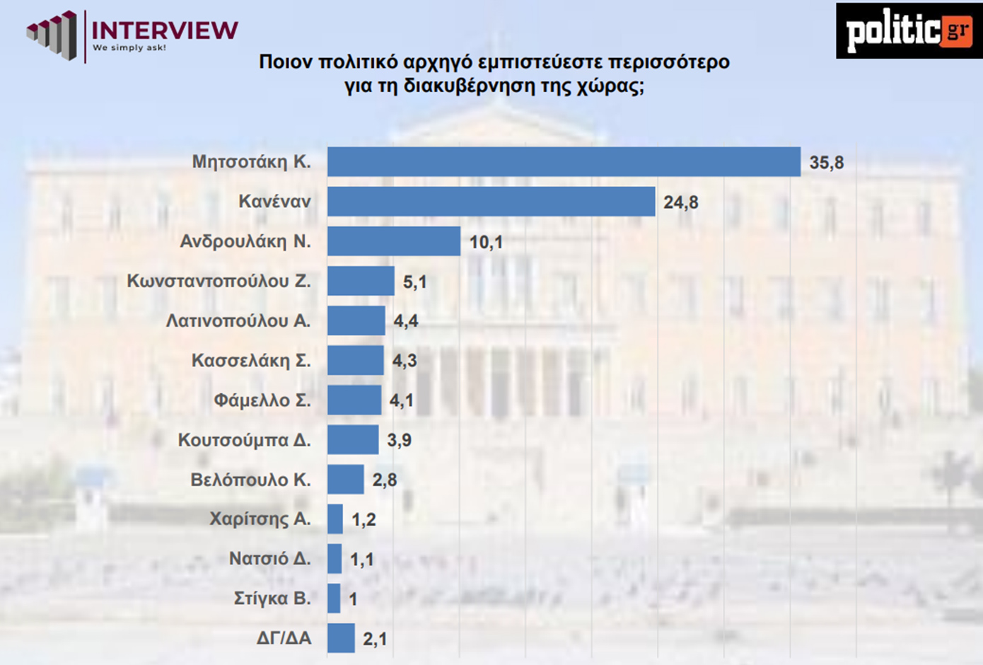Ο Κυριάκος Μητσοτάκης παραμένει το πρόσωπο που εμπιστεύεται περισσότερο η ελληνική κοινωνία για τη διακυβέρνηση της χώρας, συγκεντρώνοντας ποσοστό 35,8%. Στη δεύτερη θέση, βρίσκεται ο «Κανένας» με ποσοστό 24,8%, αναδεικνύοντας τη δυσπιστία σημαντικής μερίδας των πολιτών προς το πολιτικό σύστημα. Ο Νίκος Ανδρουλάκης ακολουθεί στην τρίτη θέση με 10,1%, ενώ η Ζωή Κωνσταντοπούλου καταλαμβάνει την τέταρτη θέση με το ποσοστό εμπιστοσύνης στο πρόσωπό της για τη διακυβέρνηση της χώρας να ανέρχεται στο 5,1%, που αν και αρκετά χαμηλότερο από τον Νίκου Ανδρουλάκη φαίνεται να τον συναγωνίζεται δυναμικά.