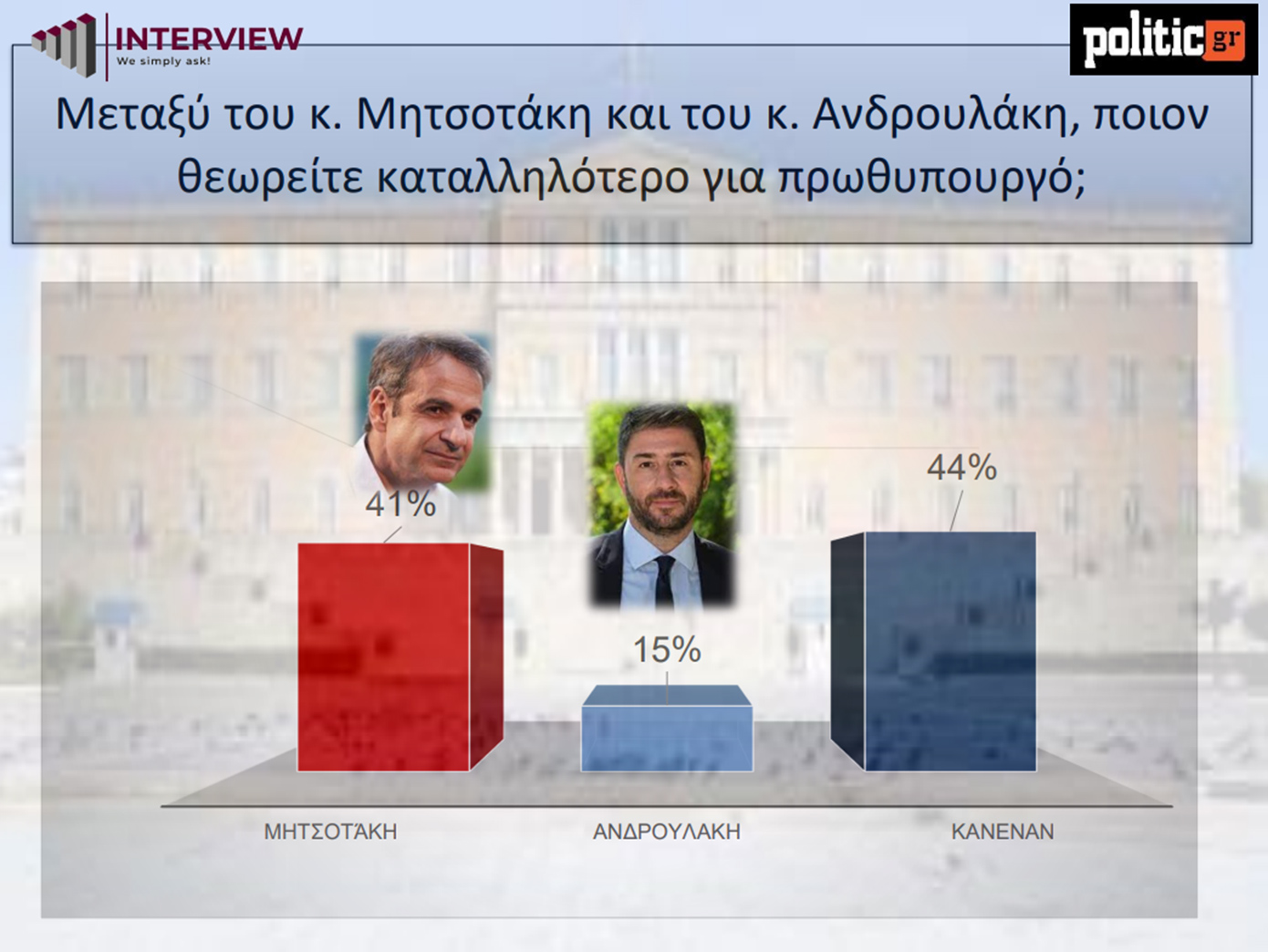 Ο Κυριάκος Μητσοτάκης θεωρείται καταλληλότερος για πρωθυπουργός από το 41% των πολιτών, ενώ ο Νίκος Ανδρουλάκης συγκεντρώνει μόλις 15%, με το 44% να επιλέγει τον «Κανέναν», καταδεικνύοντας την αυξημένη δυσπιστία προς το πολιτικό σύστημα.