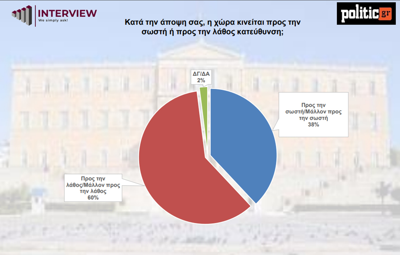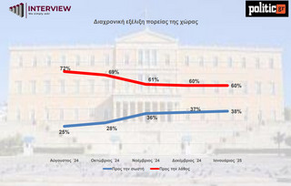 Εντωμεταξύ, παρά το γεγονός ότι έξι στους δέκα πολίτες πιστεύουν πως η χώρα κινείται προς τη λάθος κατεύθυνση, το 38% εκφράζει αντίθετη άποψη, δείχνοντας μια τάση αισιοδοξίας. Αξιοσημείωτο είναι πως το ποσοστό αυτό αυξήθηκε κατά μία ποσοστιαία μονάδα σε σύγκριση με τον προηγούμενο μήνα (Δεκέμβριος 2024), καταδεικνύοντας μια σταδιακή βελτίωση στην αντίληψη των πολιτών για την πορεία της χώρας.
