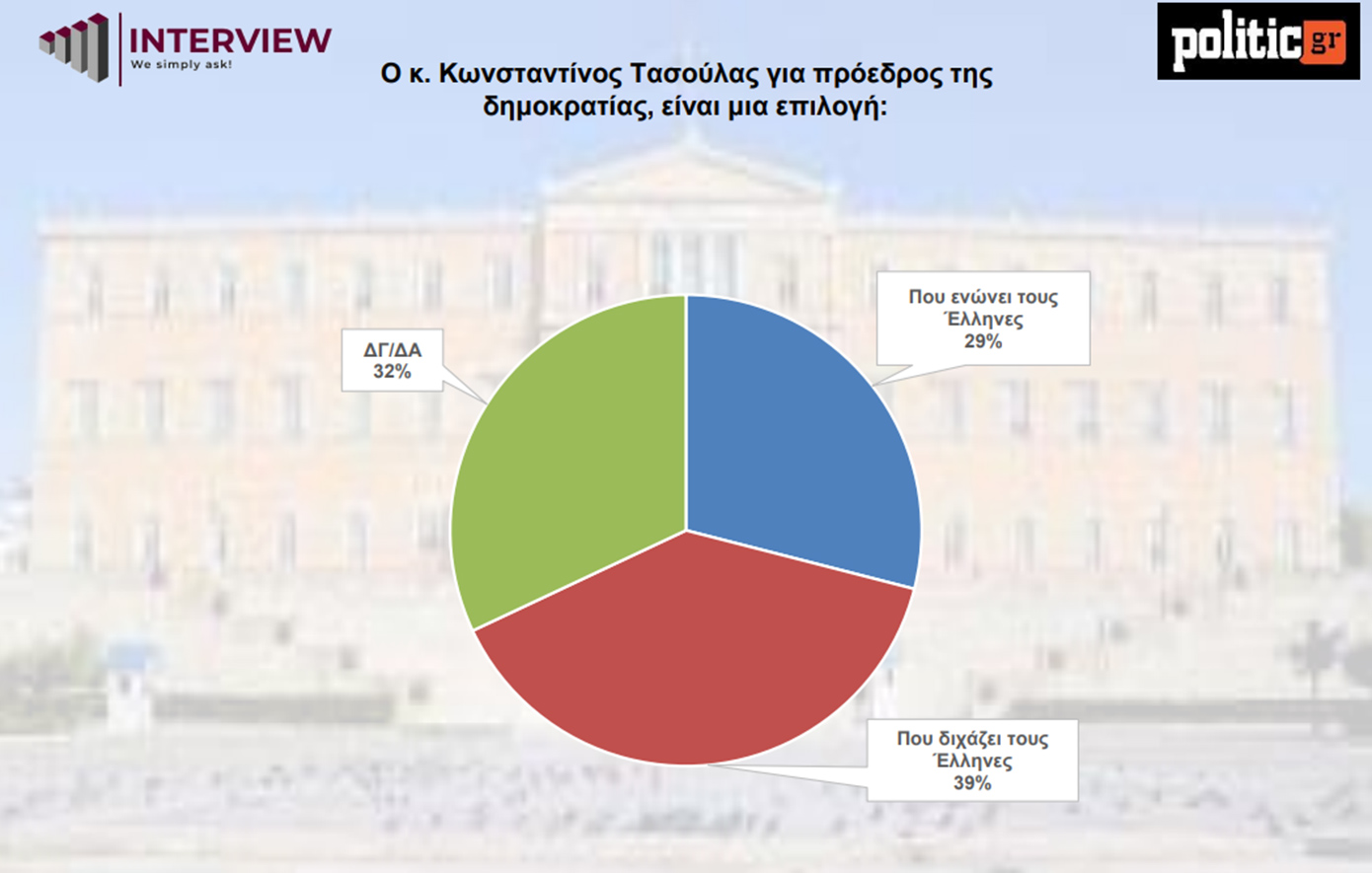 Για τον Κωνσταντίνο Τασούλα – υποψήφιο Πρόεδρο της Δημοκρατίας που πρότεινε ο πρωθυπουργός- η δημοσκόπηση αποτυπώνει ανάμεικτες απόψεις σχετικά με την ενδεχόμενη εκλογή του. Συγκεκριμένα, το 29% των ερωτηθέντων θεωρεί πως αποτελεί επιλογή που «ενώνει τους Έλληνες», ενώ το 39% πιστεύει πως είναι επιλογή που «διχάζει». Ένα 32% δεν εκφράζει άποψη.