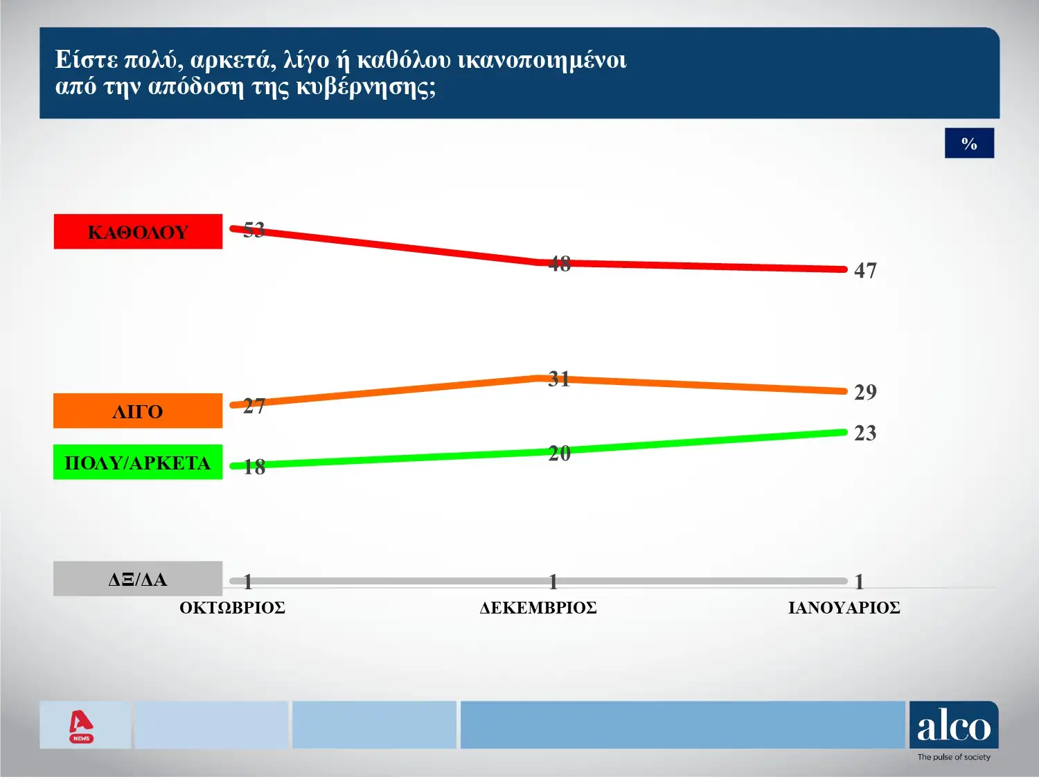 Στην ερώτηση «πόσο ικανοποιημένοι είστε με την απόδοση της κυβέρνησης» το 47% λέει καθόλου, το 29% λίγο και το 23% πολύ/αρκετά.