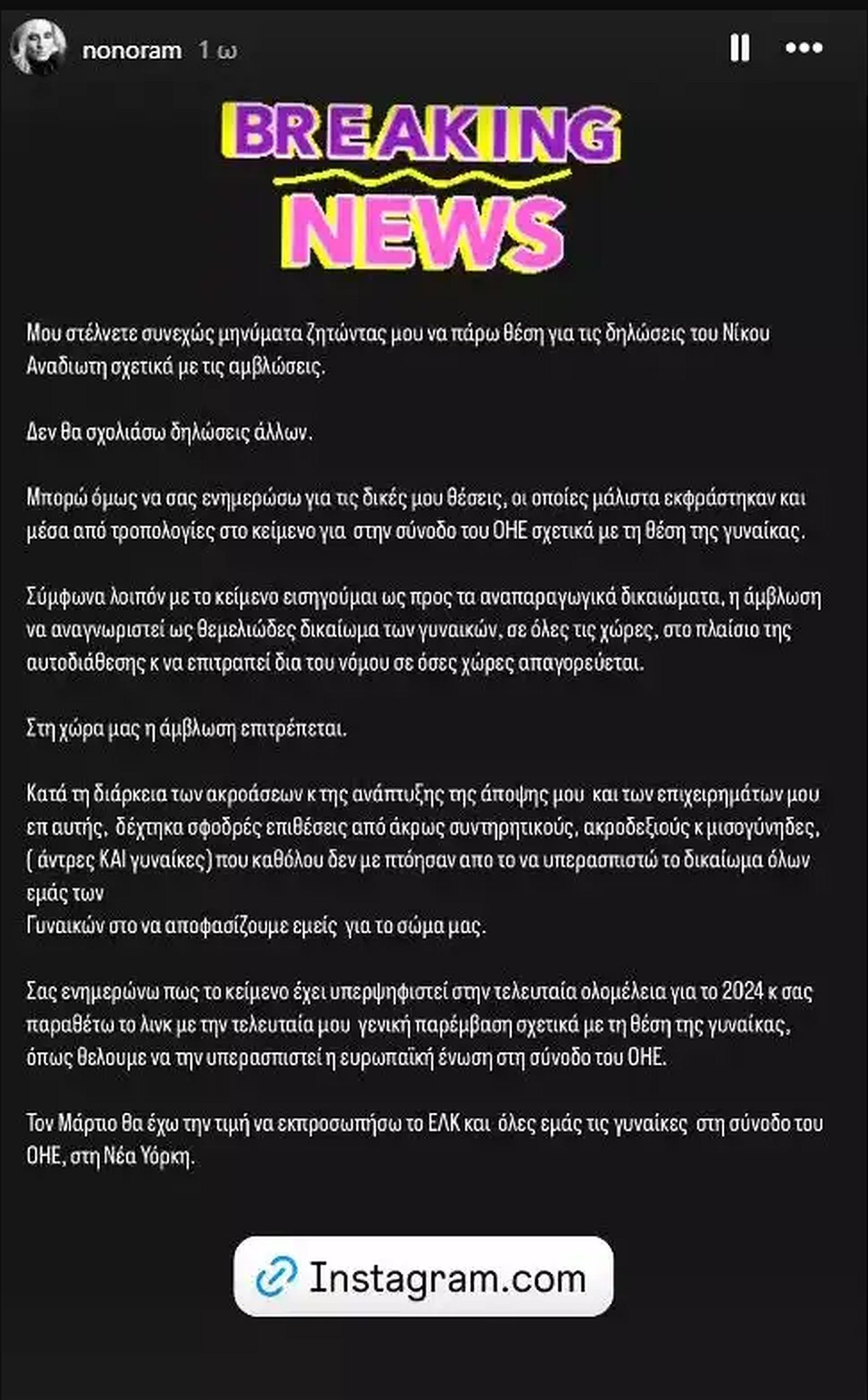 «Mου στέλνετε συνεχώς μηνύματα ζητώντας μου να πάρω θέση για τις δηλώσεις του Νίκου Αναδιώτη σχετικά με τις αμβλώσεις. Δεν θα σχολιάσω δηλώσεις άλλων. Μπορώ όμως να σας ενημερώσω για τις δικές μου θέσεις, οι οποίες μάλιστα εκφράστηκαν και μέσα από τροπολογίες στο κείμενο για στην σύνοδο του ΟΗΕ σχετικά με τη θέση της γυναίκας», επισήμανε η Ελεονώρα Μελέτη σε Insta-story το μεσημέρι του Σαββάτου (25/1).