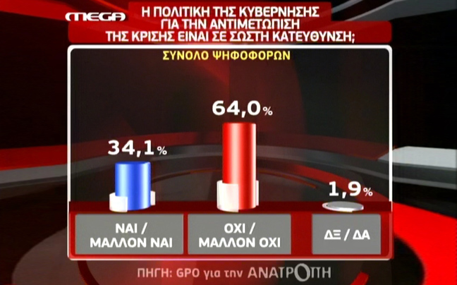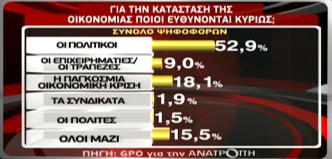 Όσον την ευθύνη για την κατάσταση της χώρας το 52,9% ρίχνει το βάρος στους πολιτικούς. Αντίθετοι με την πολιτική της κυβέρνησης είναι το 64% που θεωρεί ότι κινείται προς τη λάθος κατεύθυνση. Ένα ακόμα σημαντικό στοιχείο της δημοσκόπησης είναι ότι το 64,7% φοβάται το ξέσπασμα κοινωνικών αναταραχών.