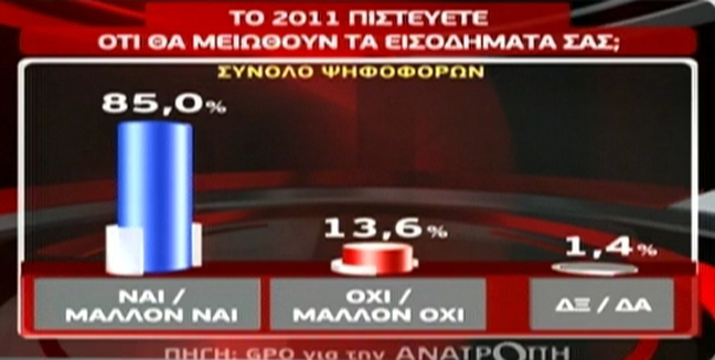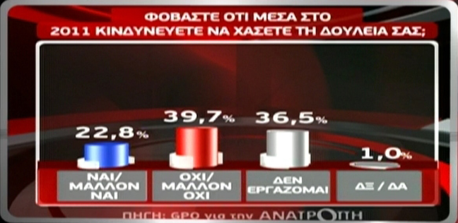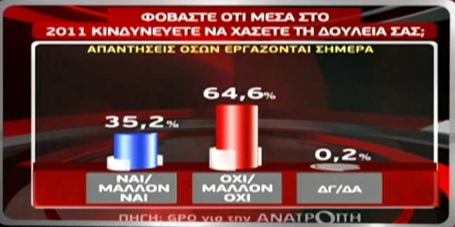 Το 36,5% δηλώνει ότι δεν εργάζεται ενώ το όσους εργάζονται το 35,2% φοβάται ότι υα χάσει τη δουλειά του. Το 85% των ερωτηθέντων αναμένει μείωση του εισοδήματός του μέσα στο 2011.