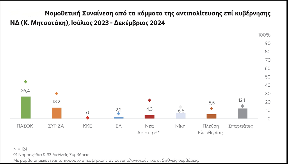 Ειδικότερα, κατά το διάστημα Ιούλιος 2023 – Δεκέμβριος 2024, η νομοθετική συναίνεση της αντιπολίτευσης στα νομοσχέδια που έφερε προς ψήφιση η κυβερνητική πλειοψηφία στο Κοινοβούλιο είχε ως εξής: